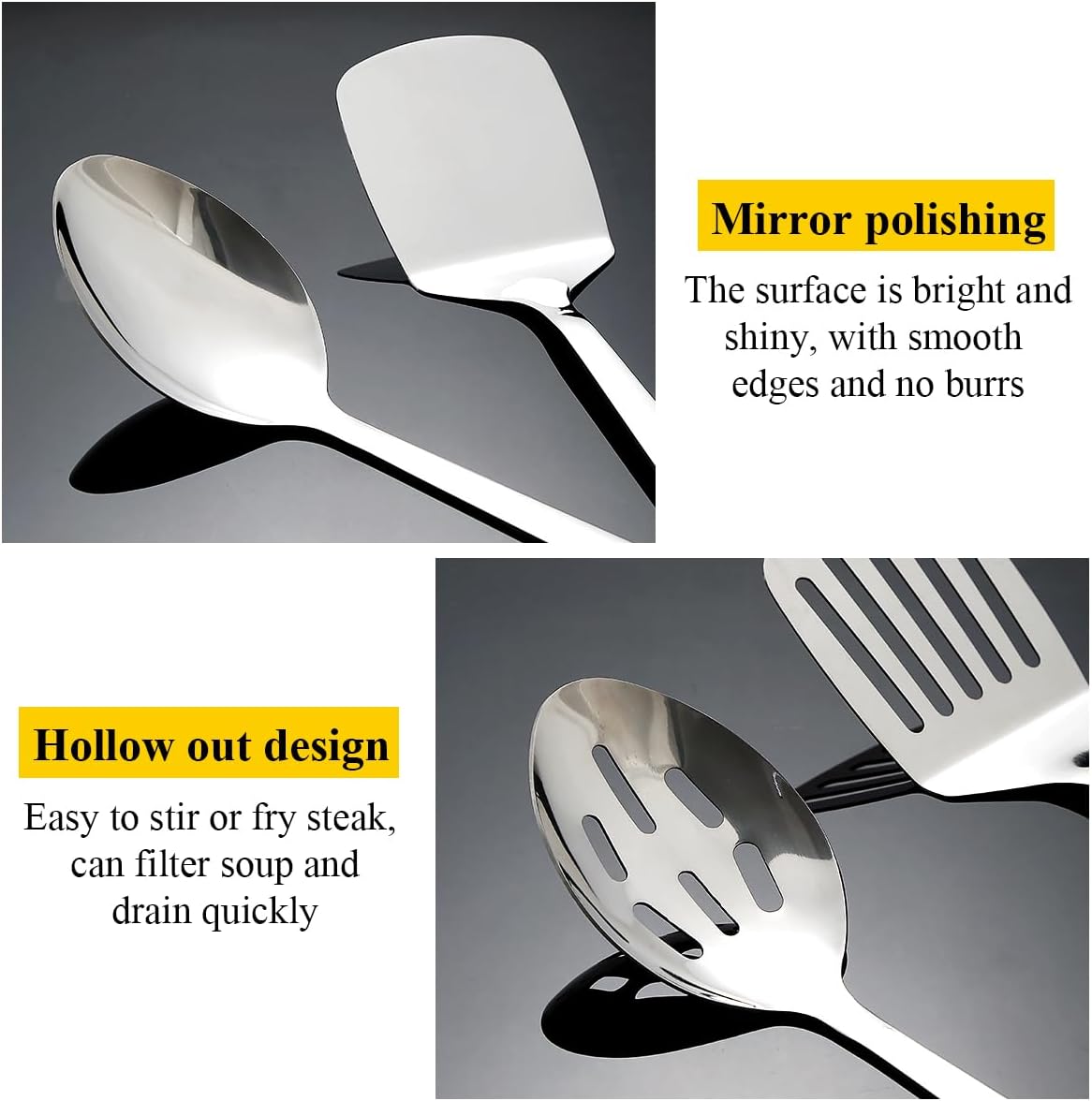 3. Sleek Design for Effortless Cleaning:Featuring smooth, polished surfaces, each utensil resists food residue buildup, making cleanup a breeze. Their seamless design also means no crevices for grime to hide, and they’re fully dishwasher-safe, saving you time and effort.