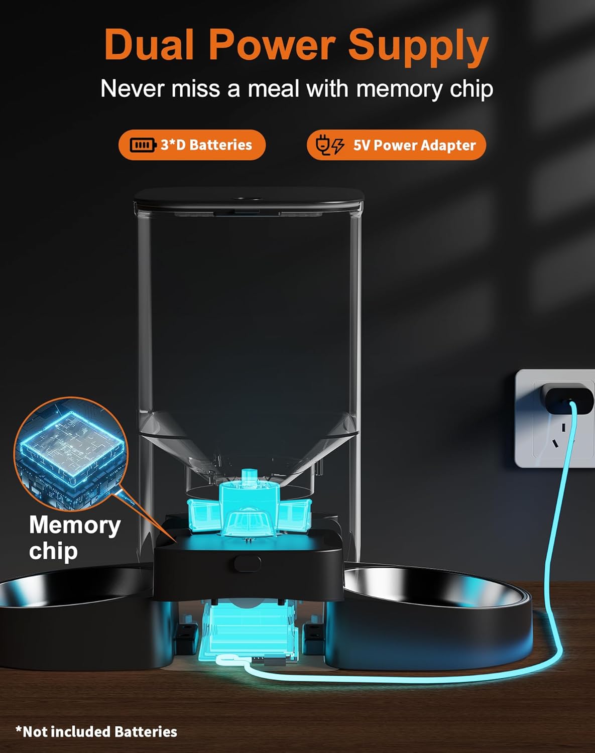 【Dual Power Supply】The feeder comes with a Type C adapter and has the option to use 3 D-cell batteries (not included), We recommend using both battery and adapter. The machine needs to be plugged in when used with wifi connection. In the event of a power outage, the automatic dog feeder will continue to run on 3 D-size batteries to ensure your pets never miss a meal.(Note: With battery power alone, the machine cannot be controlled using the app.)