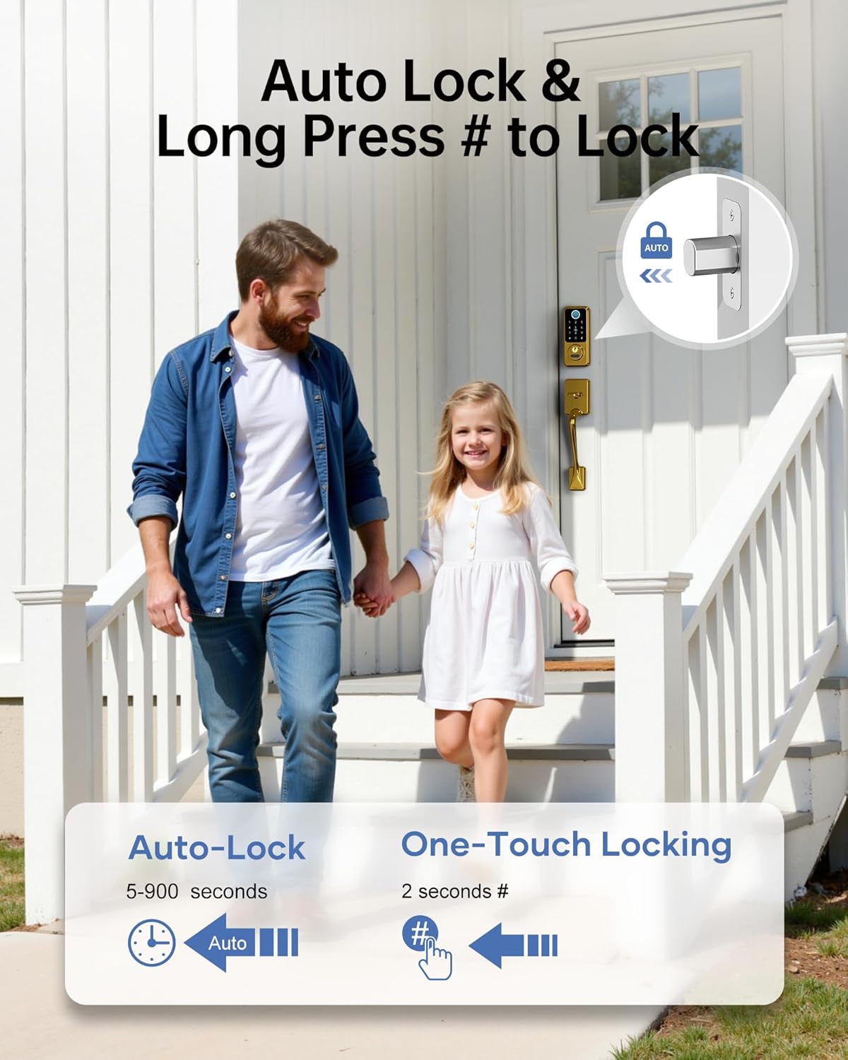 Auto-Lock & 1-Touch Locking: Never worry about forgetting to lock your door again. Set the auto-lock to engage 1-900 seconds after closing, or tap the “#” sign on the keypad for immediate locking. Perfect for busy lifestyles or added peace of mind.