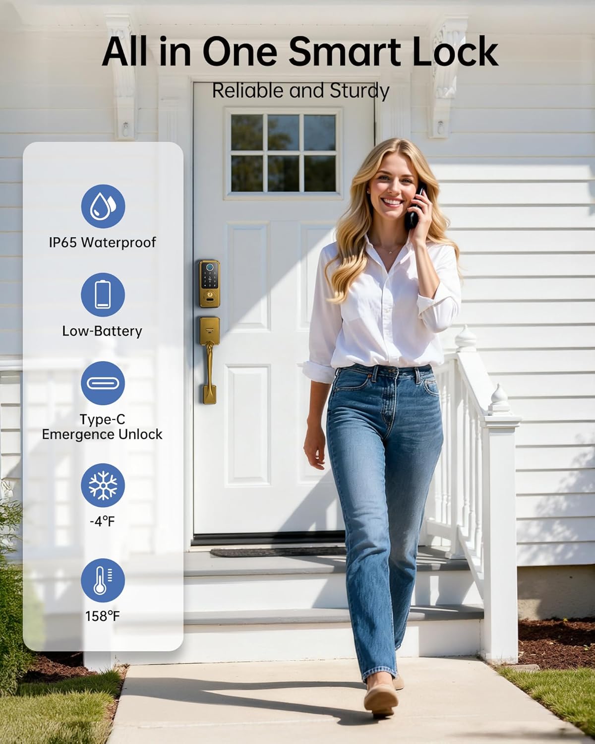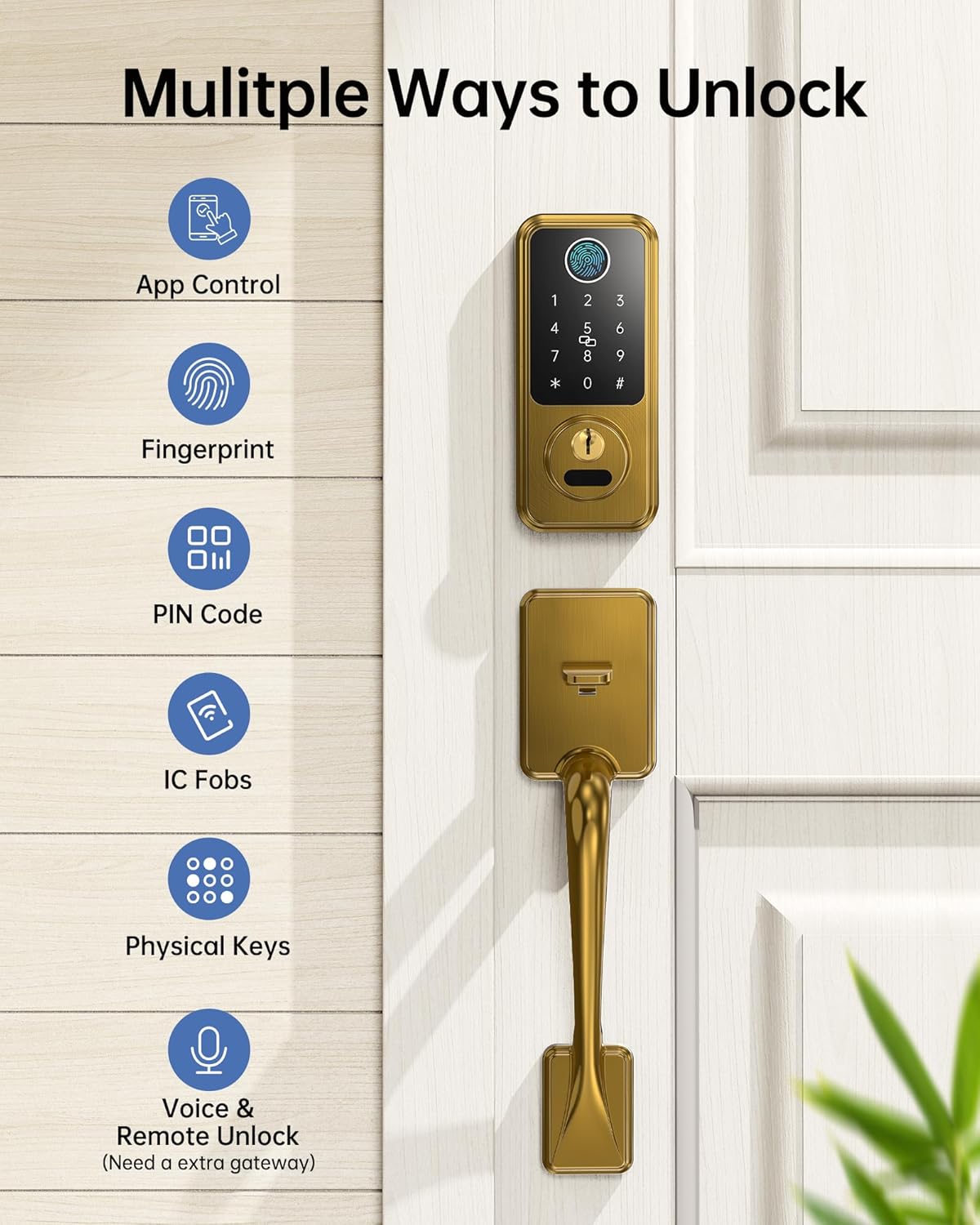 10 in 1 Keyless Entry Door Lock with Handlesets: Integrates with Next Lock App. Features fingerprint recognition, passcodes, IC fobs, keys, auto-lock, 1-touch locking, WiFi, Bluetooth, and voice control. Manage your lock easily from anywhere with the app.