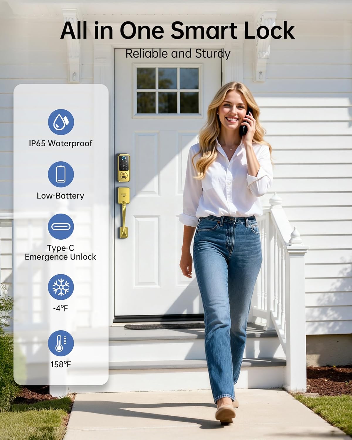 10 in 1 Keyless Entry Door Lock with Handlesets: Integrates with Next Lock App. Features fingerprint recognition, passcodes, IC fobs, keys, auto-lock, 1-touch locking, WiFi, Bluetooth, and voice control. Manage your lock easily from anywhere with the app.