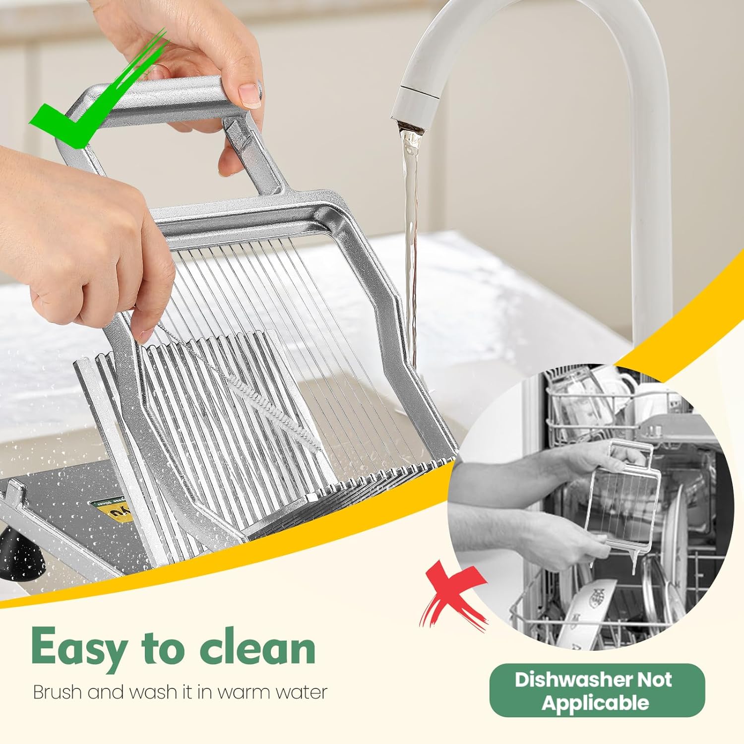 Easy to Clean: Please note that this machine is not dishwasher safe, as it may turns black (and it can’t cut strong acid or alkaline foods). However, cleaning is simple—just wash it in warm water with neutral detergent for quick and easy cleaning