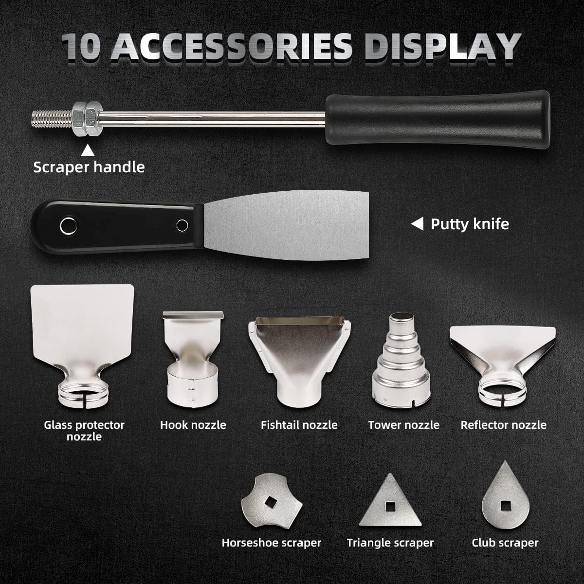 5 Nozzles & Various Accessories: The heat hot air gun has nozzles with different shapes and functions, tower nozzle, reflector nozzle, glass protector nozzle, fishtail nozzle and hook nozzle. At the same time, putty shovel and scraper(triangle scraper, club scraper and horseshoe scraper) are also included in the package. You can use these nozzles and accessories for different work conditions