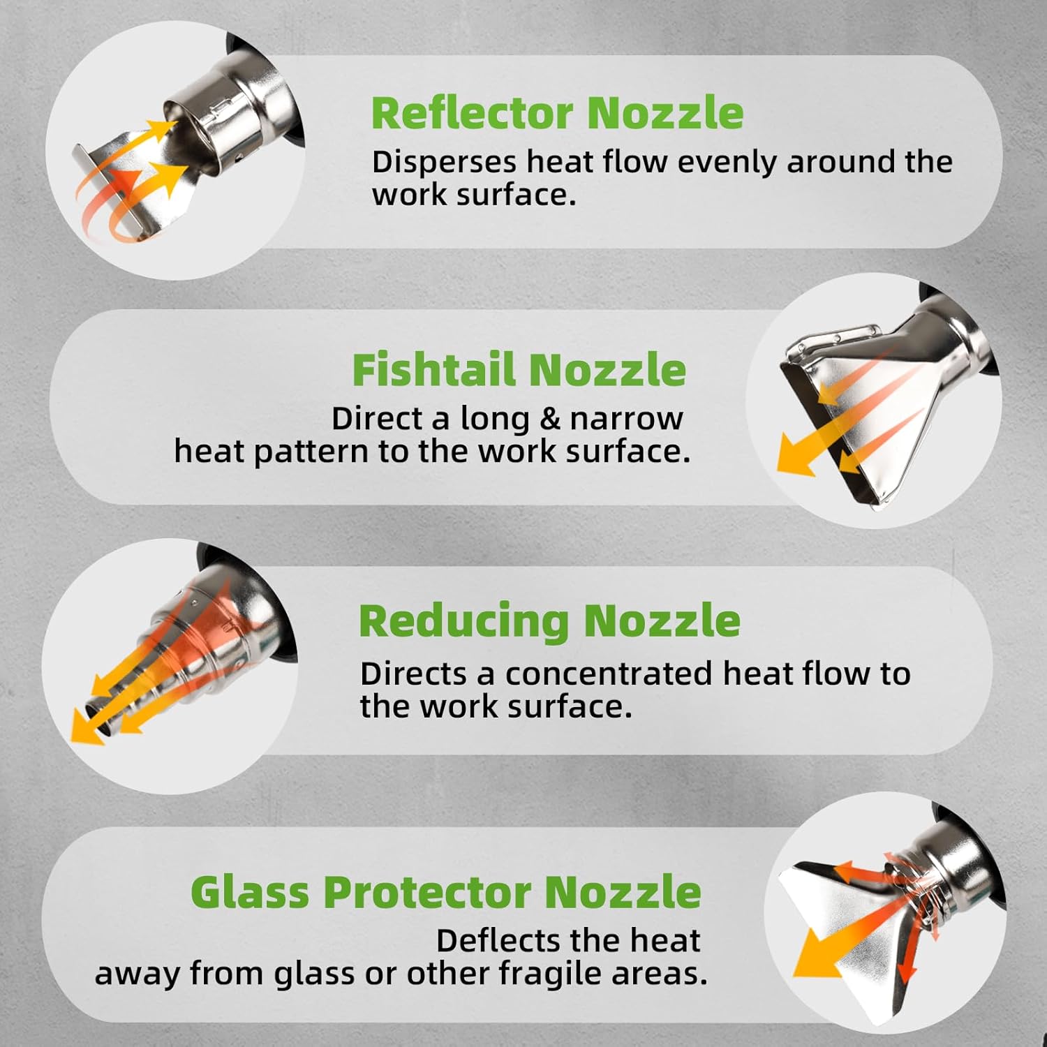 【Packaging & Support】1 x heat gun, 4 x nozzles, 1 x user manual. If you have any issues with the product, please do not hesitate to contact us