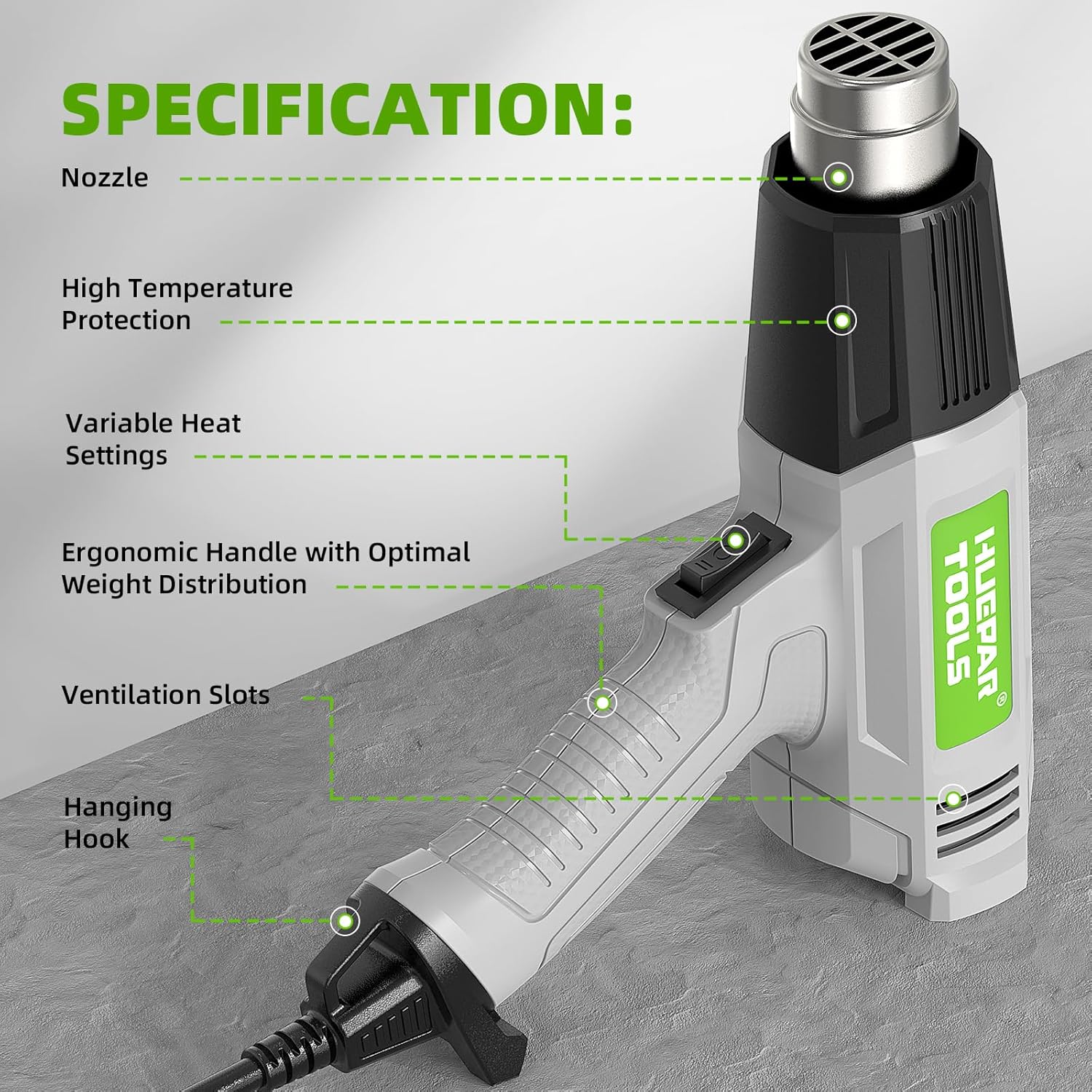 【Humanised Design】The flat-back design allows the hot gun to be placed vertically on a surface, enabling hands-free operation for extra workspace, extended usage time, and reduced hand fatigue from prolonged use. The ergonomic handle features a non-slip grip design for comfort during long periods of use. Additionally, the hot air gun comes with hooks for easy storage