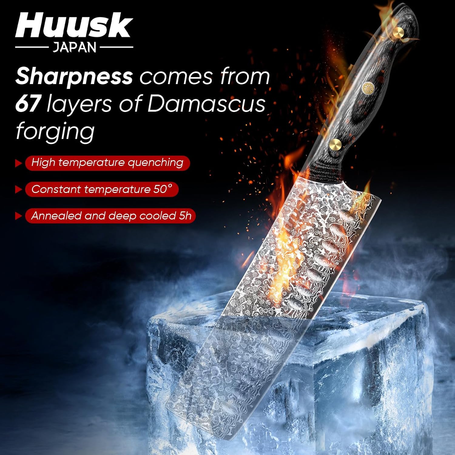 The Pinnacle of Craftsmanship: Huusk Damascus Nakiri Knife. Meticulously hand-forged by master smiths through 138 processes, employing repeated folding and forging to expel impurities from the steel and merge pure steel layers, ensuring ultimate sharpness and durability. Nitrogen cooling ensures unparalleled hardness and flexibility.