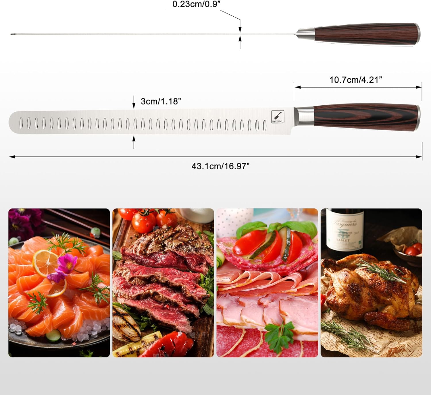 Comfortable and Durable Wooden Handle: Designed for long prep sessions, the ergonomic pakkawood handle offers a natural feel and firm grip. Perfectly balanced and comfortable to hold, this meat carving knife helps reduce wrist strain during extended carving tasks