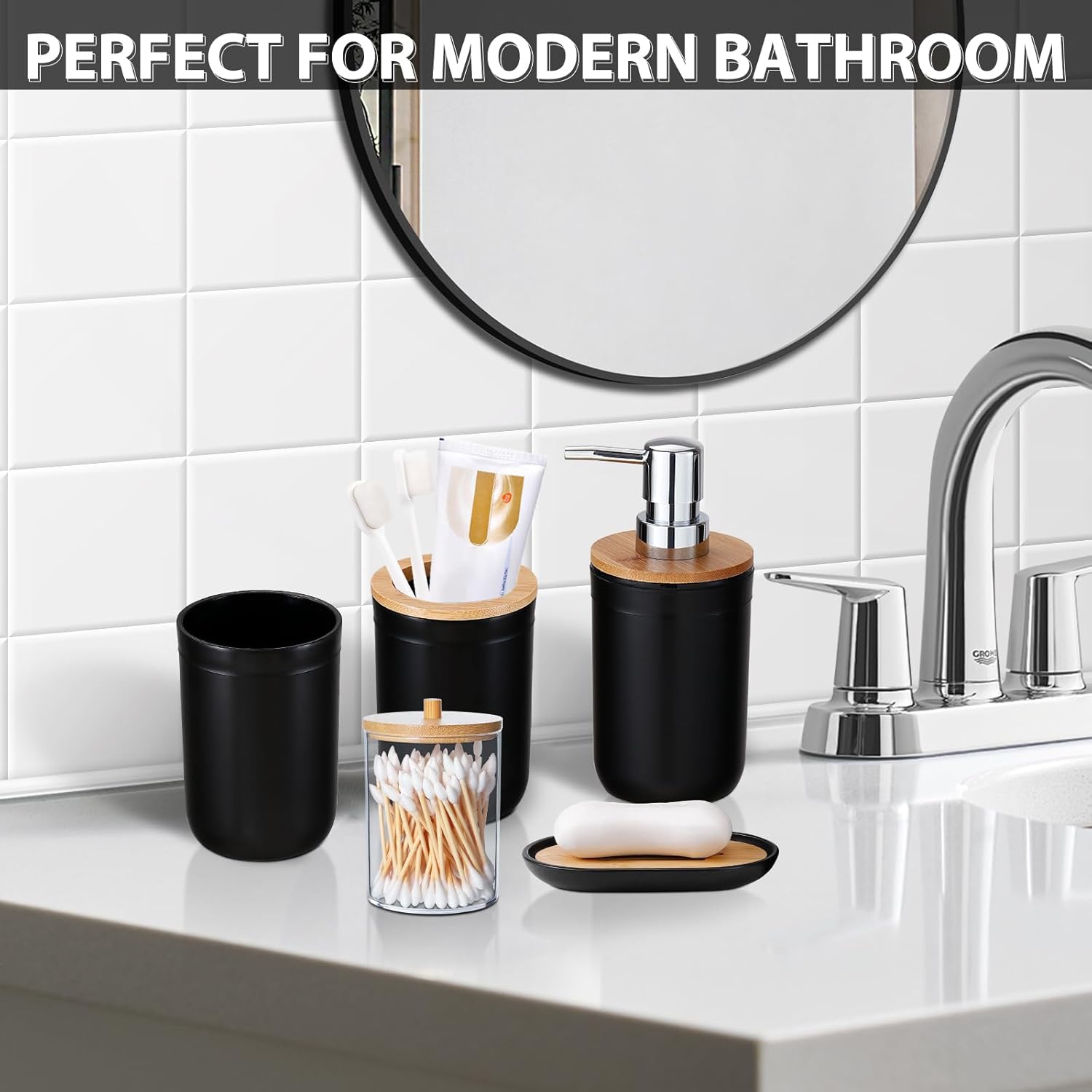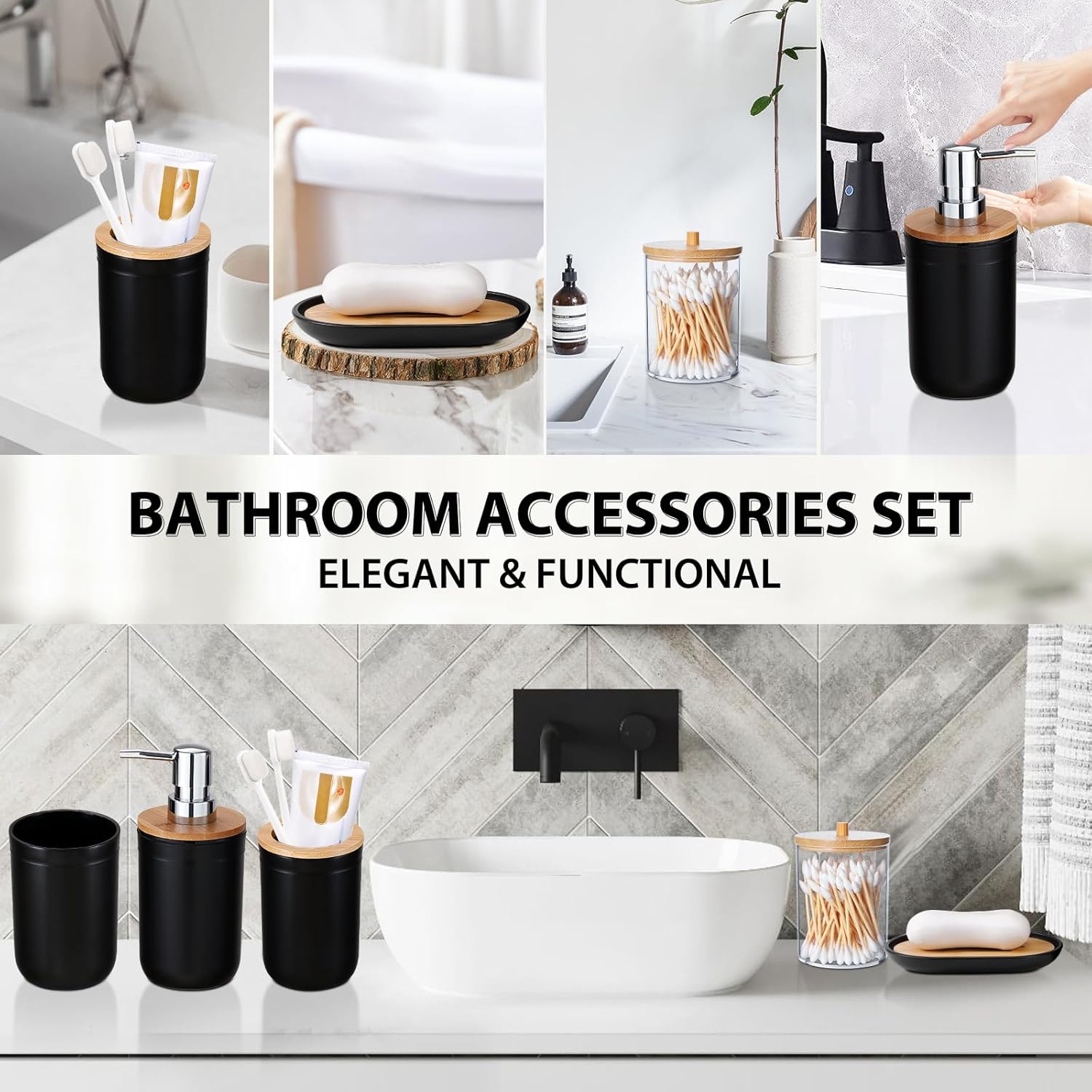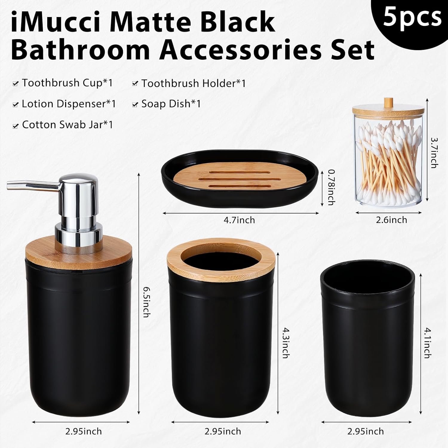1.5Piece Bathroom Accessories Set Includes:1 Soap Dispenser, 1 Toothbrush Holder, 1 Toothbrush Cup, 1 Soap Dish,1 Q-tips.