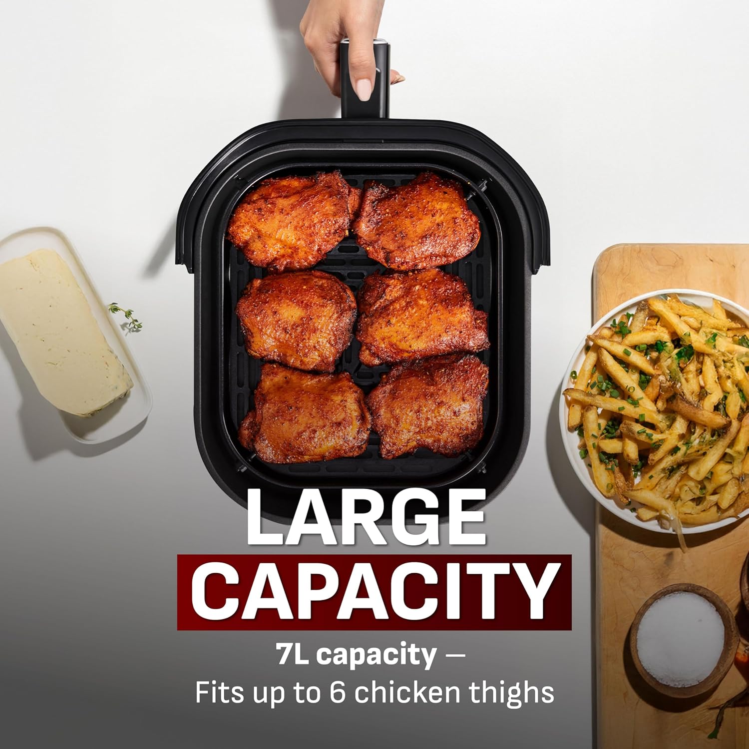 This air fryer delivers next-level cooking with our Infrared 2.0 Air Fryer with dual heating system. This large capacity air fryer, powered by a robust 1800W, delivers infrared speed for faster, juicier, and crispier results every time. The air fryer kitchen appliances also have a dual-heating system that combines top infrared heating with a powerful bottom heater for even, top-down cooking with maximum heat distribution.