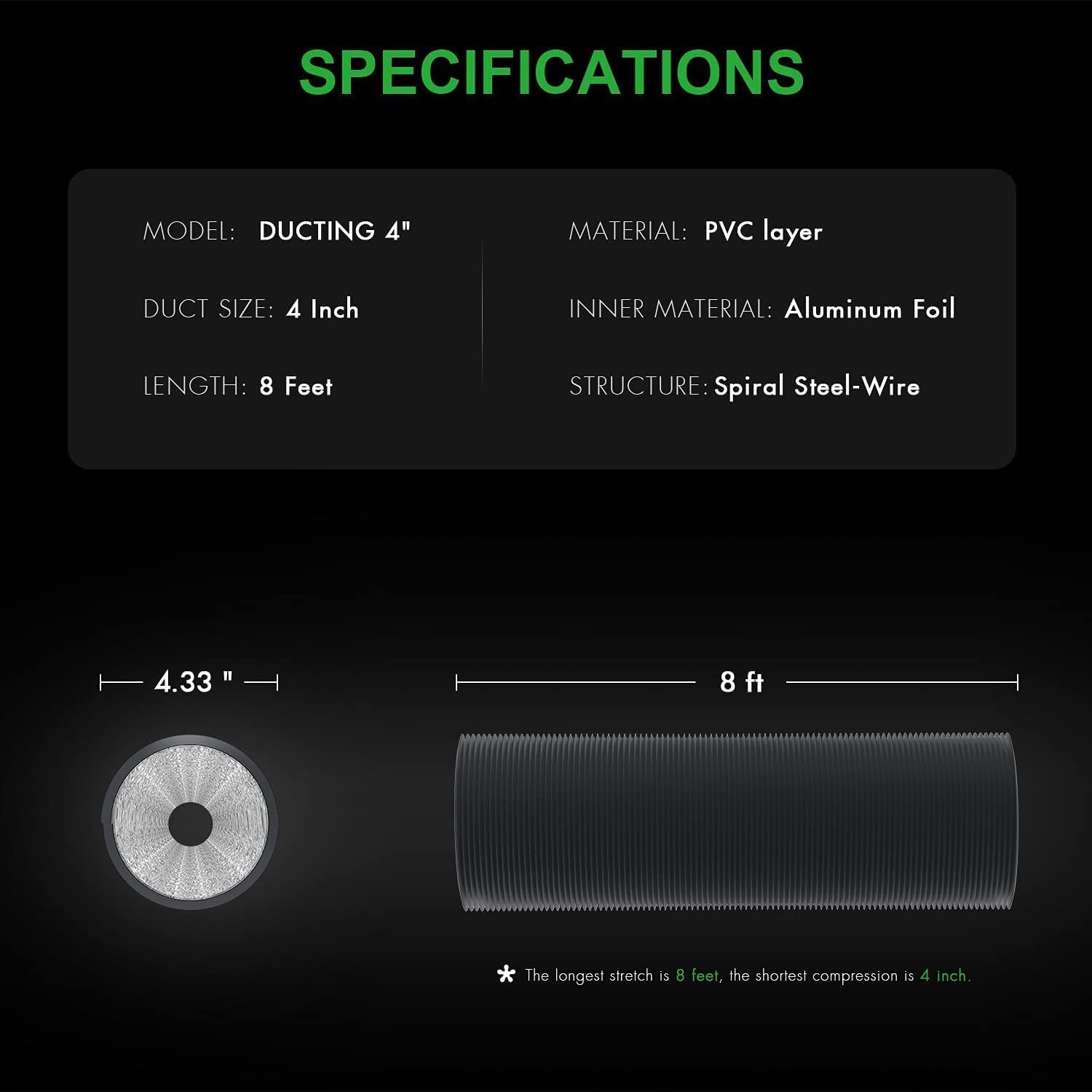 Specifications: Diameter: 4 inch; length: 8 feet; material: PVC thermoplastic; inner material: aluminum foil. Temperature range: -22°F~212°F(-30℃~100℃)