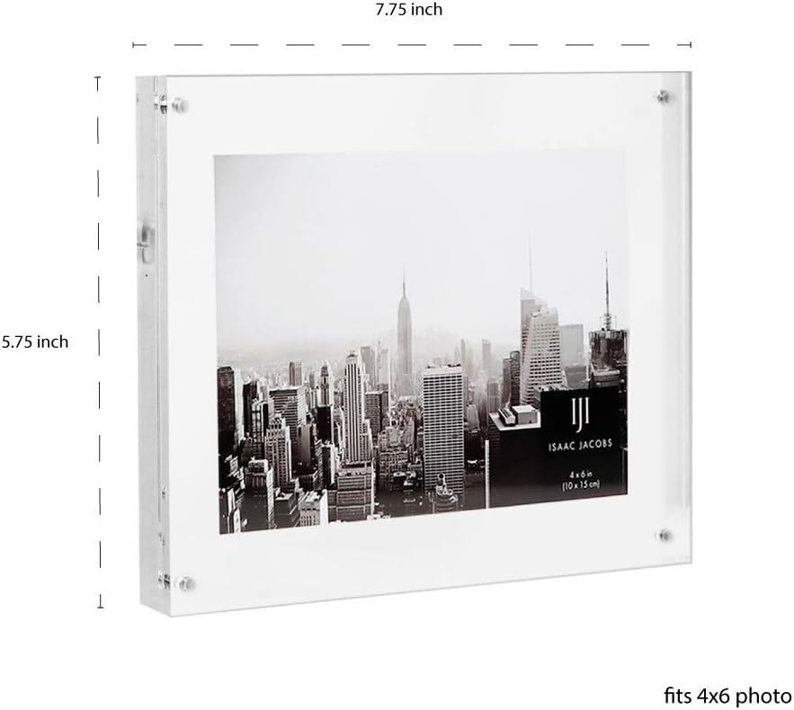 SPACE SAVING & STYLISH: This Isaac Jacobs Wall-Mountable Clear Acrylic Frame shows off your beautiful photos, both vertically and horizontally. Create a home art gallery with this modern magnetic frame or showcase portraits beautifully on your wall space. This frame’s actual dimensions are 5.75” tall x 7.75” wide. 4” x 6” photos fit beautifully in the middle pane of the frame, which fits exactly that size photo. (This frame is not meant for smaller sizes)