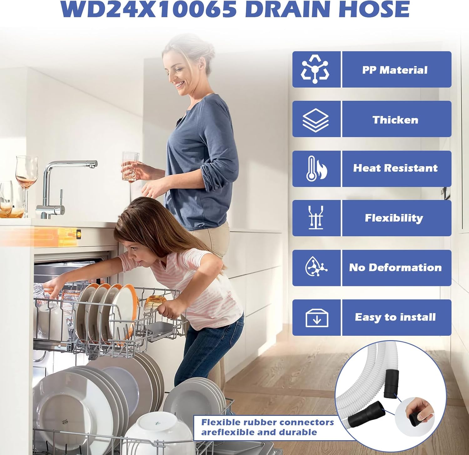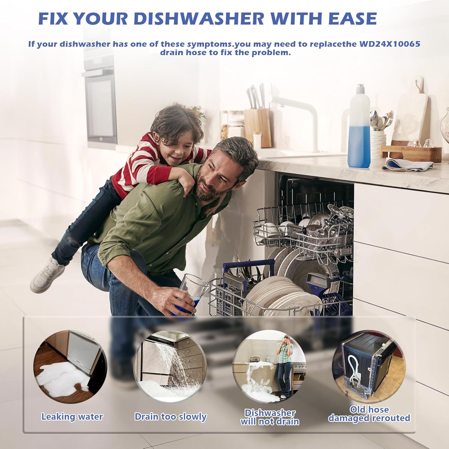 Solve Problems:If your dishwasher has one of these symptoms.you may need to replacethe WD24X10065 drain hose to fix the problem.(1.Leaking water 2.Drain too slowly 3.Dishwasher will not drain 4.Old hose damaged rerouted)
