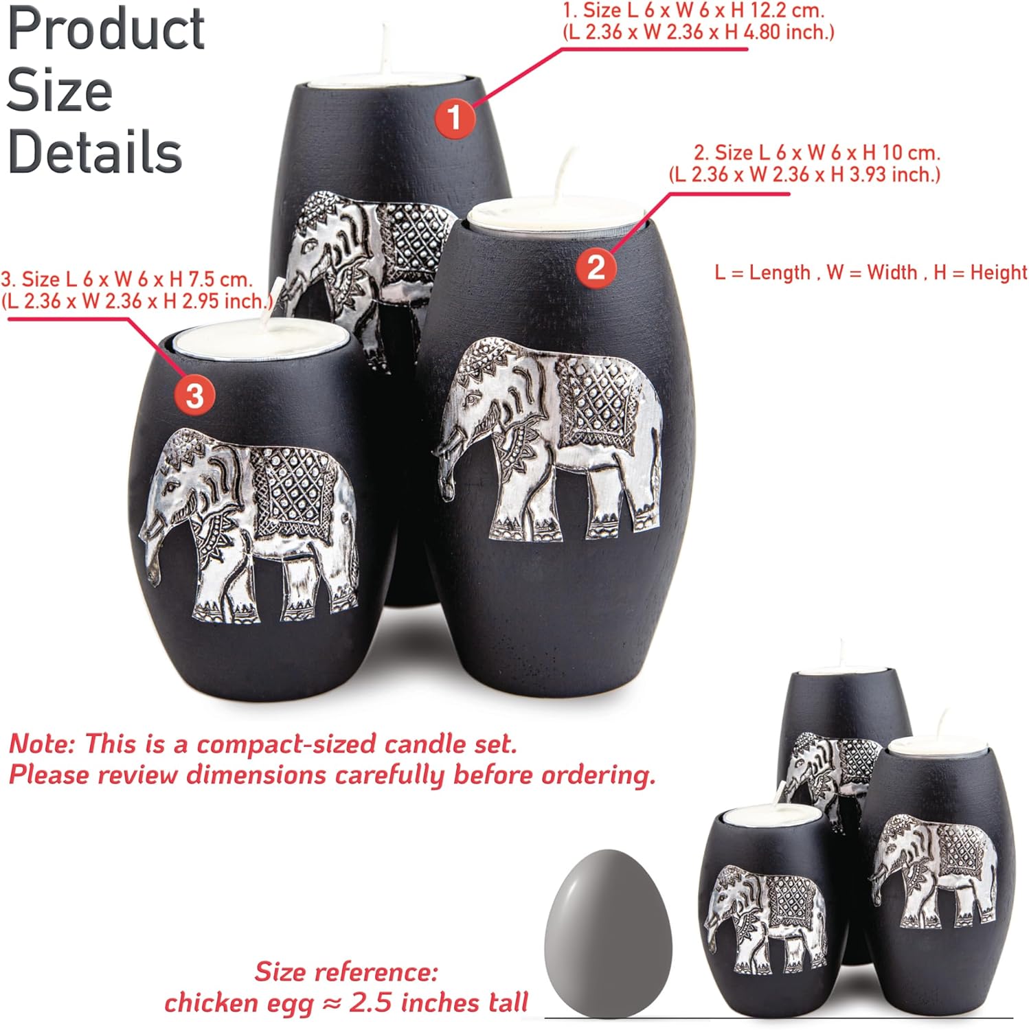 Experience an elegant fusion of craftsmanship and functionality with the IYARA CRAFT Decorative Elephant Tealight Candle Holders Set. These three distinctive holders, carved in stair-step sizes and styled in a chic black matte wood finish, effortlessly enhance any room with their warm, ambient glow. They serve as the perfect accessory in your office, kitchen, living room, or even the bedroom, promising to enrich the atmosphere with their inviting charm. Each holder showcases an intricate antique detailing of an adorned elephant, skillfully inlaid with aluminum, ensuring a conversation starter among guests. The varying heights, from approximately 3 to 5 inches, along with the middle size at nearly 4 inches, all nestled on a sophisticated dark wooden tray with an imitation woven floor, present an engaging visual balance. This unique, durable, and artistically pleasing set ensures a touch of luxury that will delight any interior decorator for years to come.