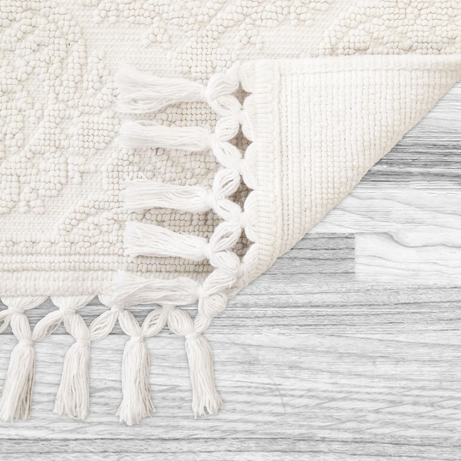 This Jean Pierre Collection is the perfect addition to your home with its cozy, bohemian and decadently soft bath rugs. Crafted with a geometric fashionable design that has a super soft and dashing knotted fringe tassels on both sides creating the perfect look that will never go out of style. Constructed with a tufted 100% cotton material, creating a soft to the touch experience that is thick and absorbent. This collection is available in many styles and sizes, making it the perfect addition to your home. It easily pairs with similar tones and patterns as well as different textures. When cleaning this natural bath rug, we recommend vacuuming without a beater brush. If liquid, blot with a clean, undyed cloth. For hard-to-remove stains, professional cleaning is recommended.