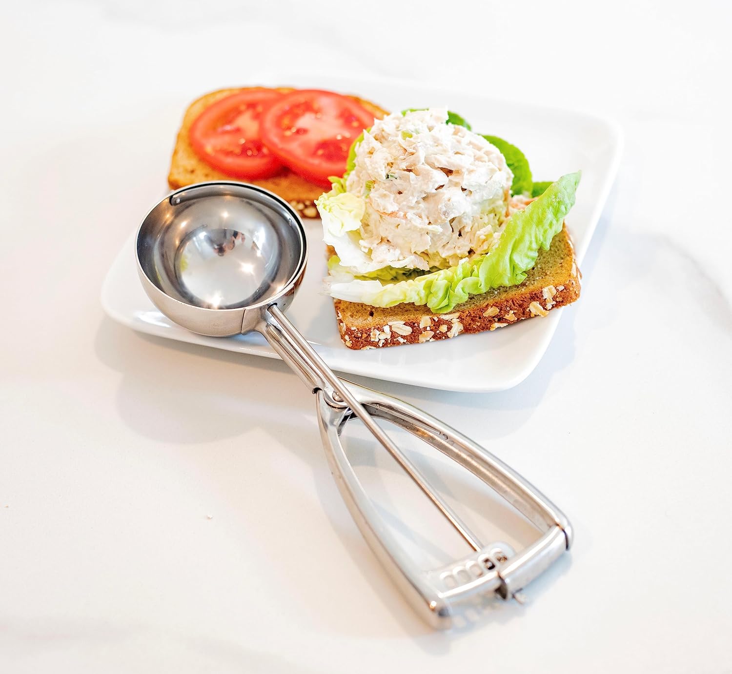 VERSATILE FOOD & BAKING SCOOP: This multifunctional kitchen tool does more than scoop ice cream and extra large muffins. Enhance your food prep with 1/2 cup sized rice balls, pancake batter, deli salads and more.