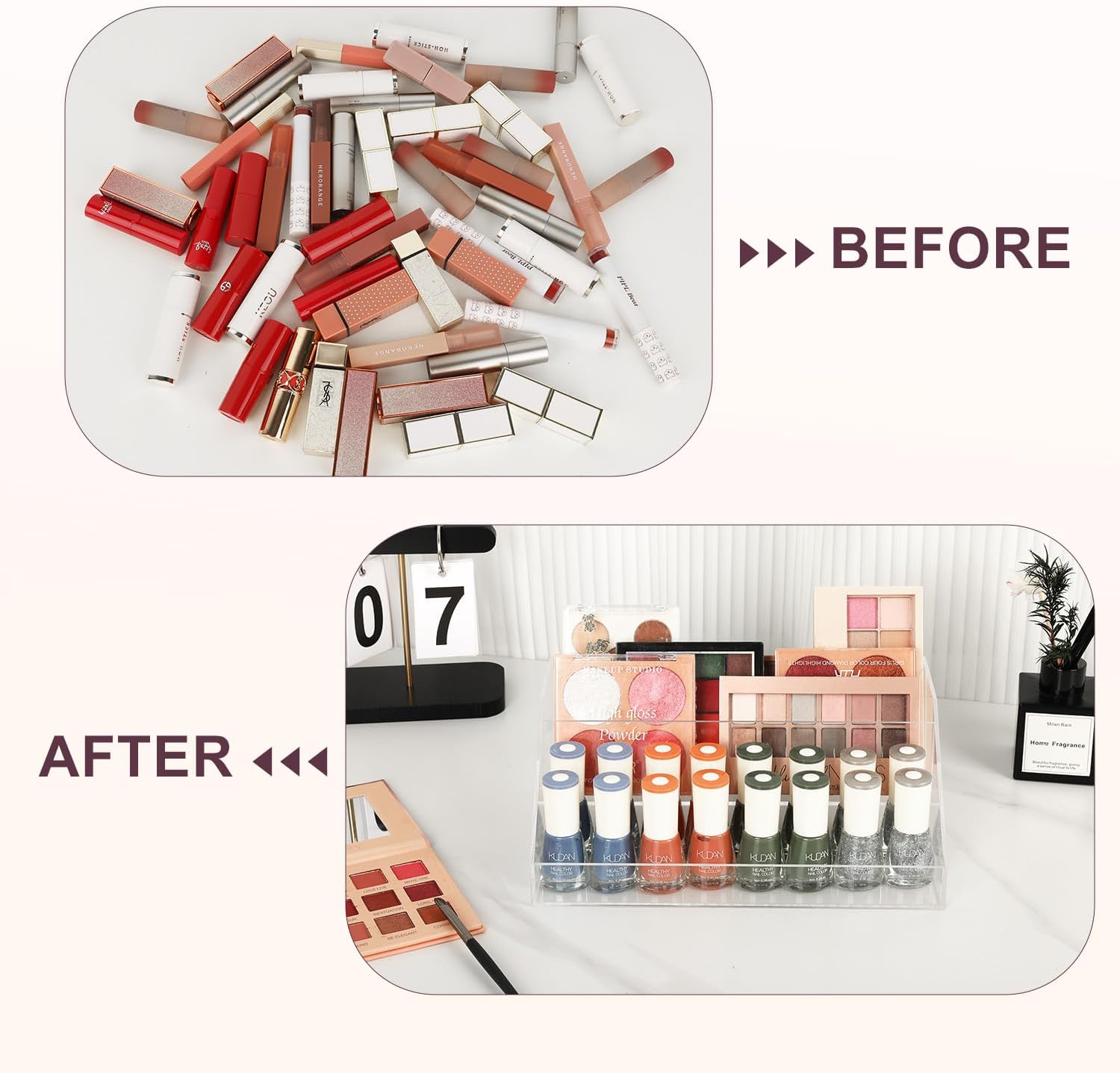 Tiered Design: elevates storage efficiency with a layered setup perfect for sorting makeup items from small lipsticks to larger skincare products