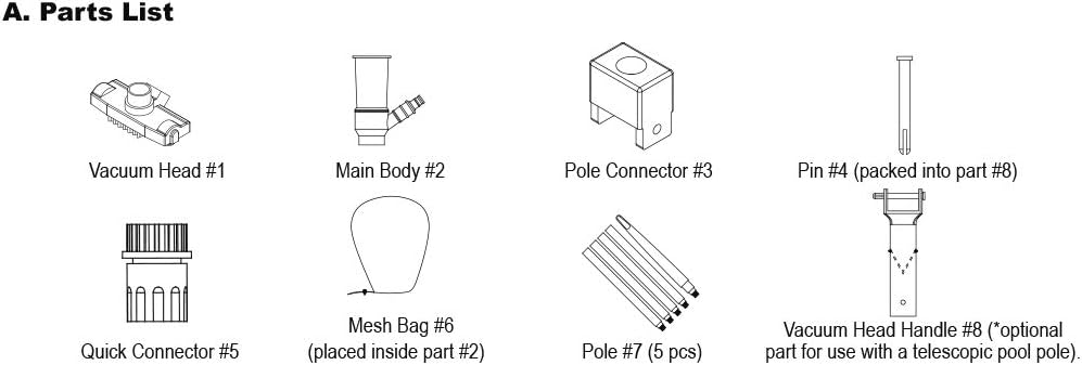 Simply assemble the vacuum cleaner together and connect it to your garden hose. The water pressure from your garden hose creates an Venturi effect which sucks up debris and leaves into the vacuum’s collection bag. No ELECTRIC POWER required. It is PORTABLE and very HANDY to use. Ideal for frame above ground/inflatable pools, spa, waterfall, fountain, and pond. It is also perfect for vacuuming inground spa and small pool. ***Note: Package comes with an extra white vacuum head handle, you can use it with a telescopic pole (Not included) to vacuum your pool.***