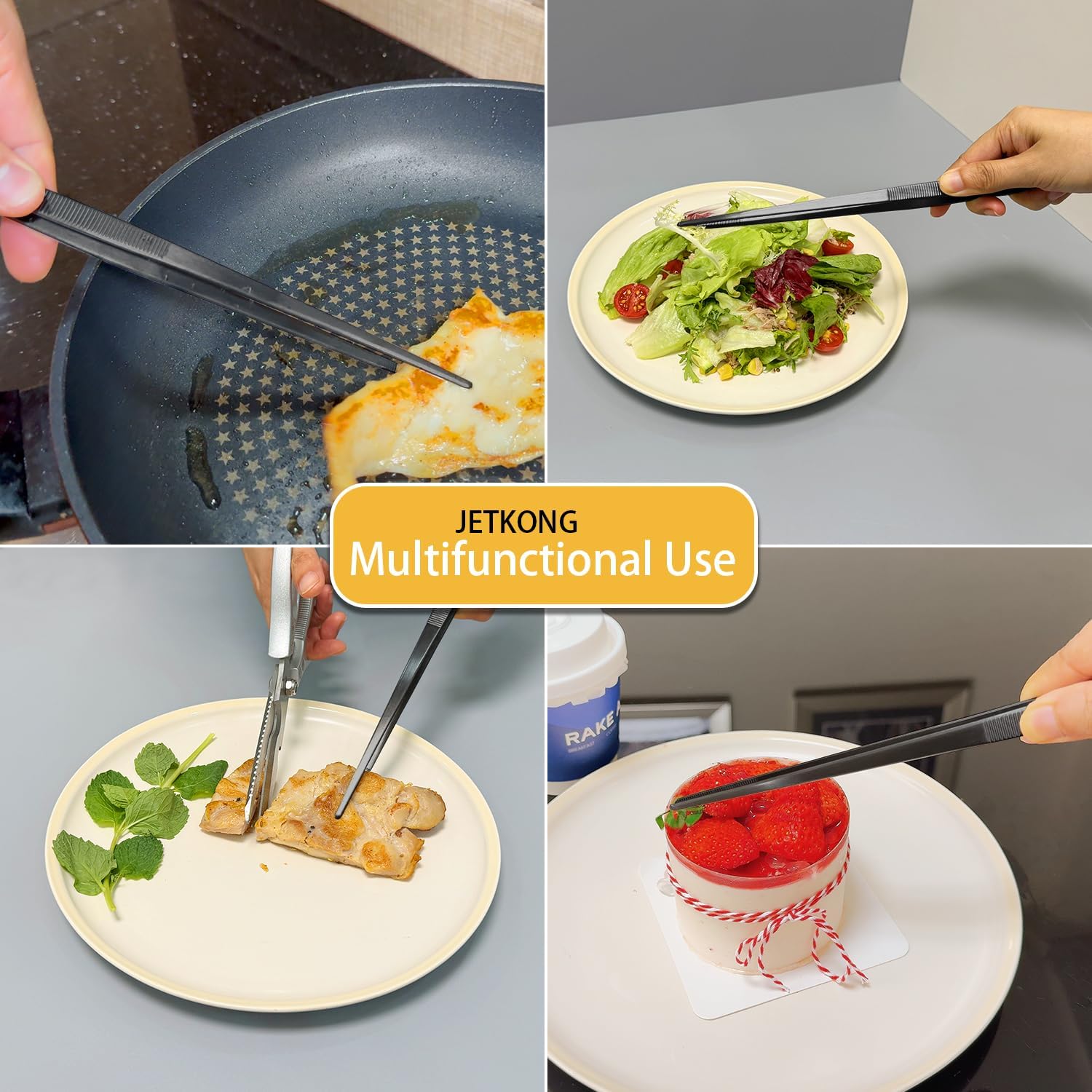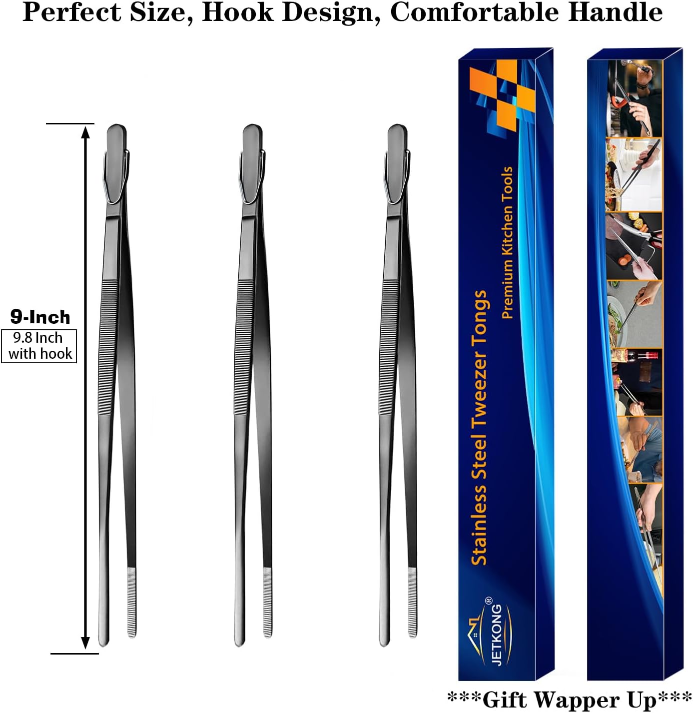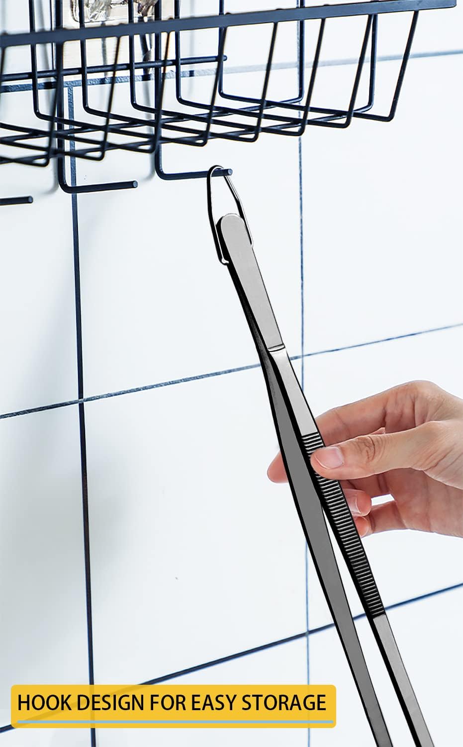 ERGONOMIC DESIGN – These tweezers design with comfortable ergonomic shape, precision tweezer food tongs to protect your movements. The tip of the cooking tweezers is slender and easy to hold and extend into a narrow space. The hook design at the rear makes it easy to store and hang in any corner of the kitchen.