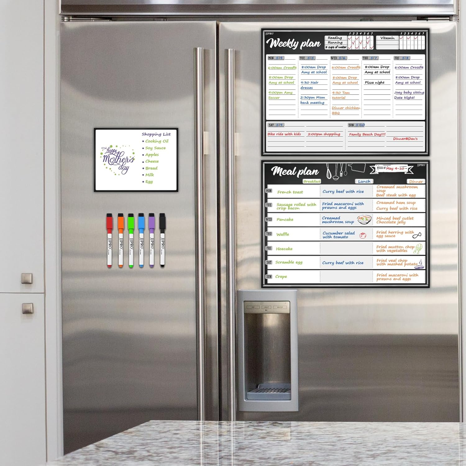 COMBO SET provides flexibility: JJPRO combo set includes one 14.5″x11″ magnetic meal planner, one 14.5″x11″ magnetic weekly planner and one 7.25″x5.5″ magnetic whiteboard; This combo set fits most size refrigerators mini or full size, single door or side-by-side, super flexible and easy to use