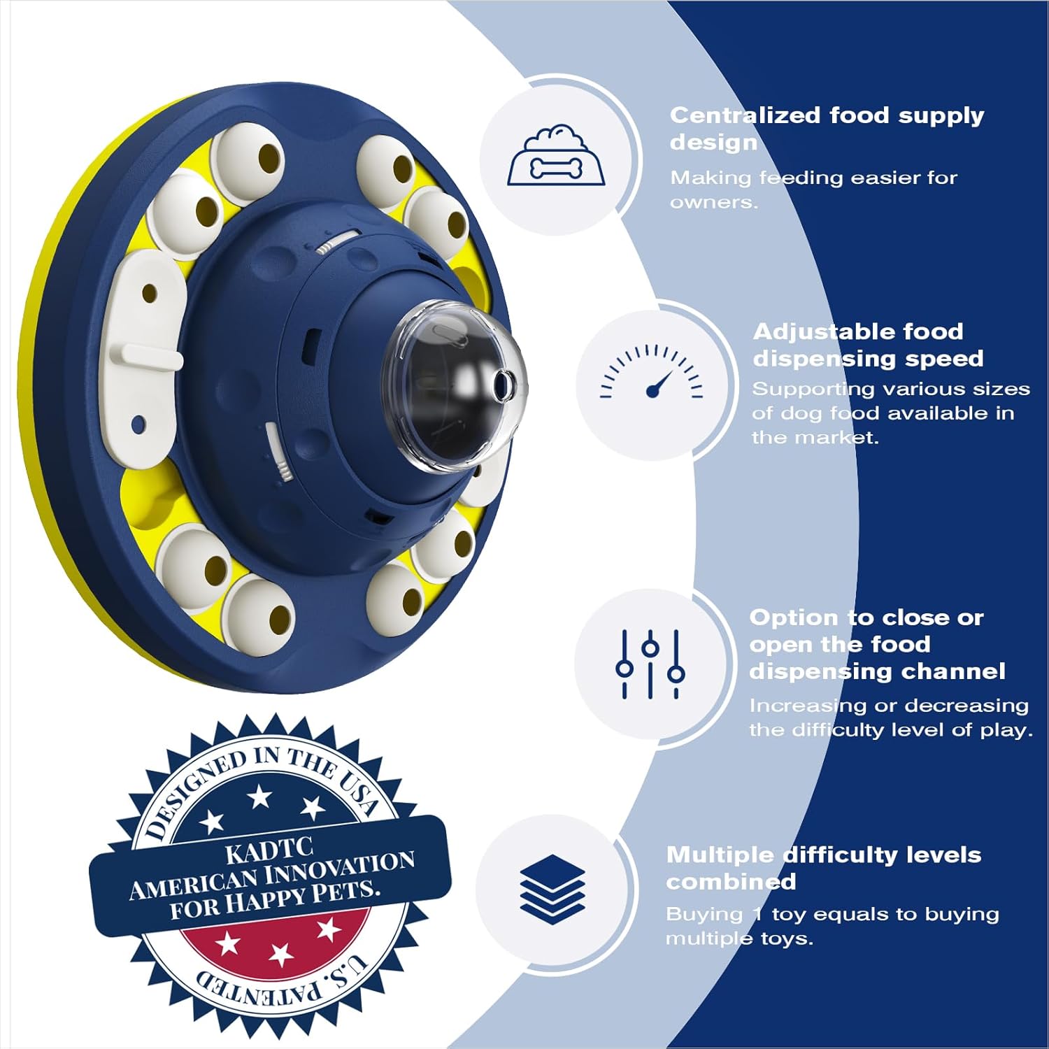 [Innovative U.S. Design with U.S. Brand and U.S. Patent] KADTC, an American brand, proudly introduces this innovative dog puzzle toy, designed and patented in the USA. Featuring a unique centralized food dispensing design, this toy not only entertains your dog but also promotes slow eating habits, improving digestive health. The toy’s food granary can hold up to 10.05 ounces of food, making it an ideal choice for both mental stimulation and physical activity. Perfect for birthdays, holidays, and special occasions!