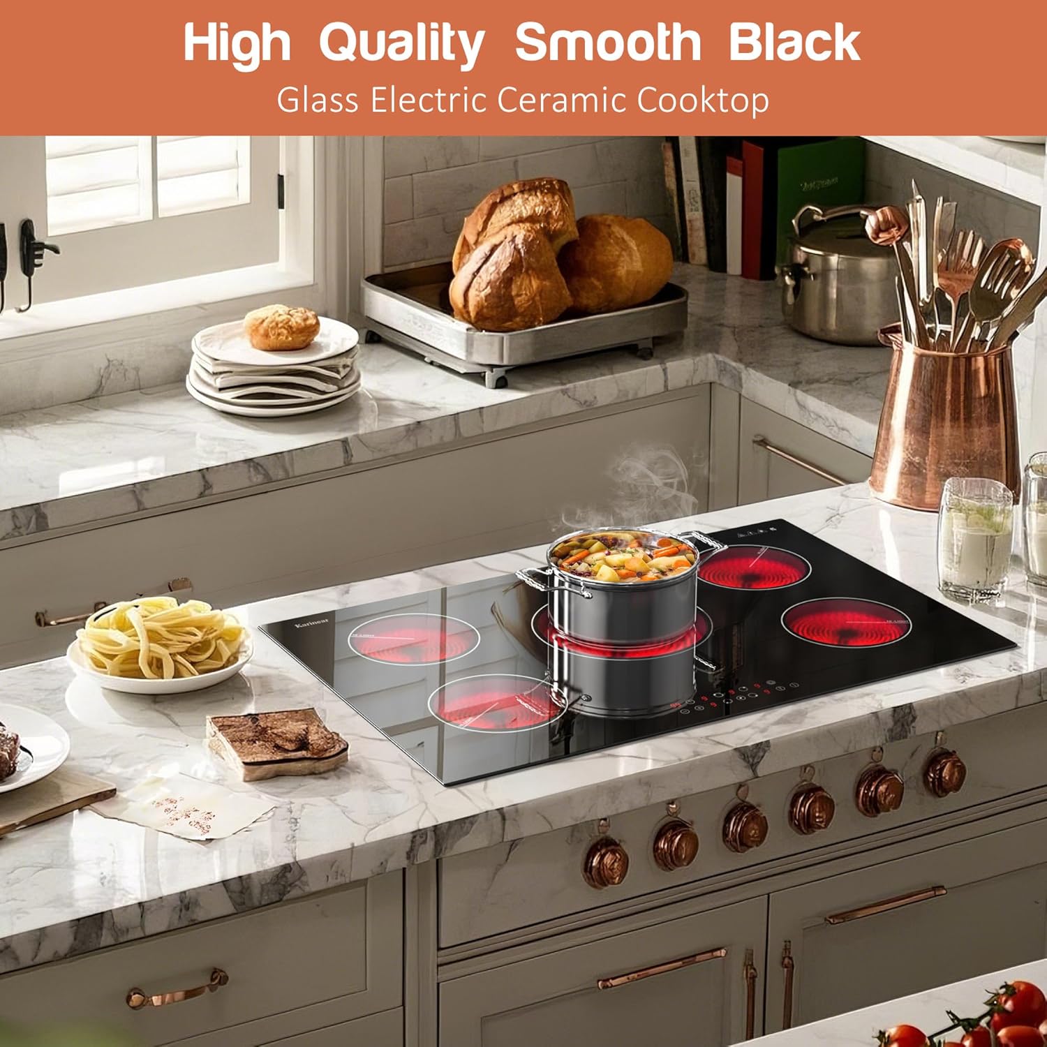 【Safe and Multi-Functional Electric Cooktop】The 30 inch electric stove is highly convenient and safe, thanks to its numerous advanced functions, including a child safety lock, a 99-minute timer, automatic shut-off, a pause function, a hot surface indicator, and over-temperature protection. Additionally, this electric ceramic stove emits no electromagnetic radiation, ensuring it is harmless to the human body. The sensor touch control electric cooktop is safe for everyone to use.