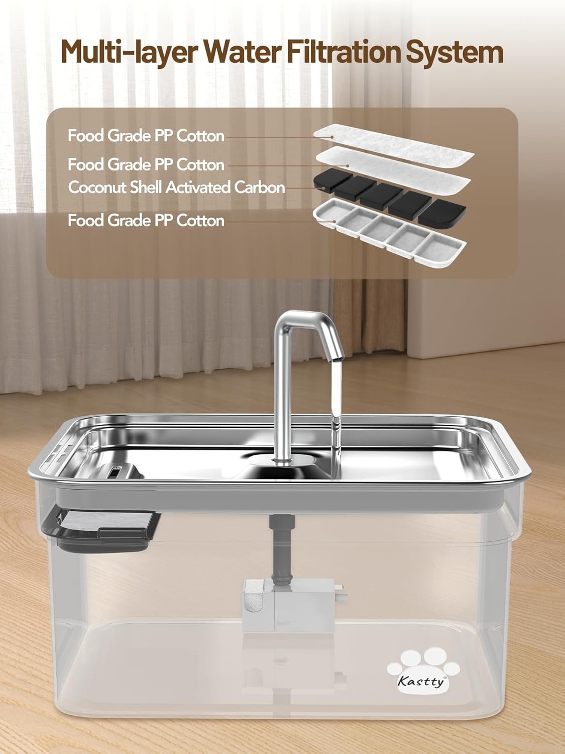 Advanced 5-in-1 Filtration System: Our high-end coconut shell activated charcoal filter captures hair, heavy metals, and even invisible contaminants, ensuring your pet’s water is clean and tastes fresh. The 5-row design of our 7-ply ultrafiltration system is not only larger but also more effective and economical