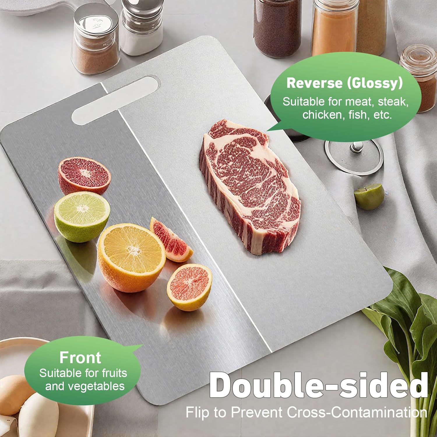 PREMIUM TITANIUM CUTTING BOARD: Made from pure titanium, this double-sided titanium cutting board is designed with versatility in mind—use the front for fruits and vegetables and the back for meats.