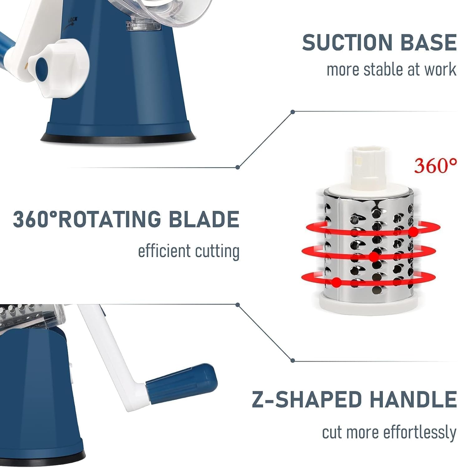 🧀Humanized Design: Reasonable drum-type rotating vegetable shredder has powerful suction feet for stability on your table. The rotary cheese grater with handle is very efficient and easy to operate! The parts can be easily disassembled, which makes the cleaning more convenient and simple. It also saves storage space and makes your kitchen cabinet less crowded.