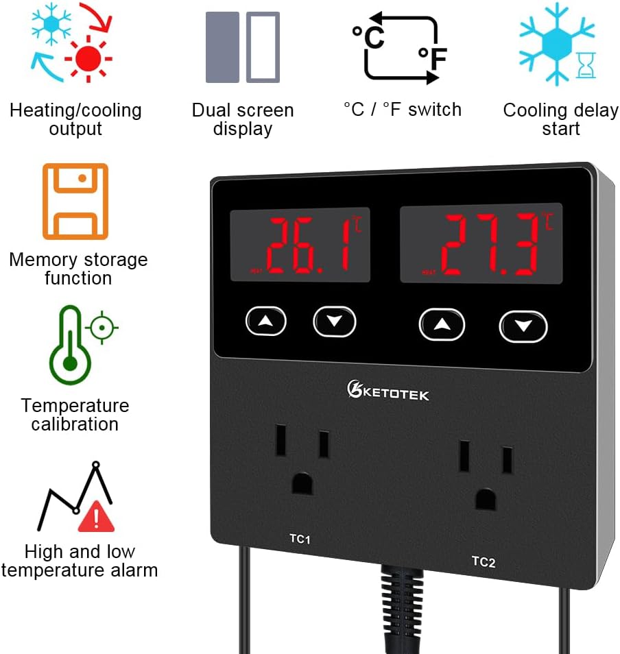 KETOTEK KT99pro Dual Digital Temperature Controller Outlet 10A Relay Heating Coolling Thermostat Controlled Socket with Sensor for Reptile Brewing Fermentation Breeding Incubation Greenhouse