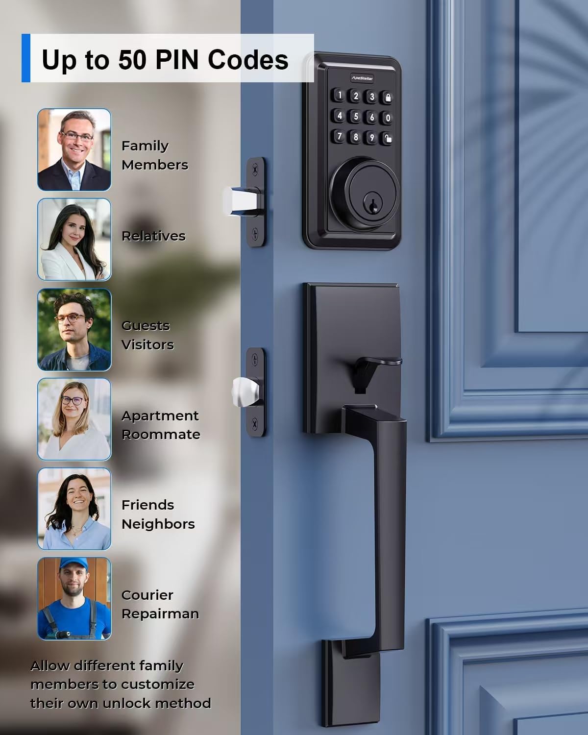 Keyless Entry Door Lock Deadbolt with Handle Set: Apestellar smart door lock can create 50 passcodes for family daily use along with temporary one-time passcodes, for visitors, service personnel or other single-use entry.