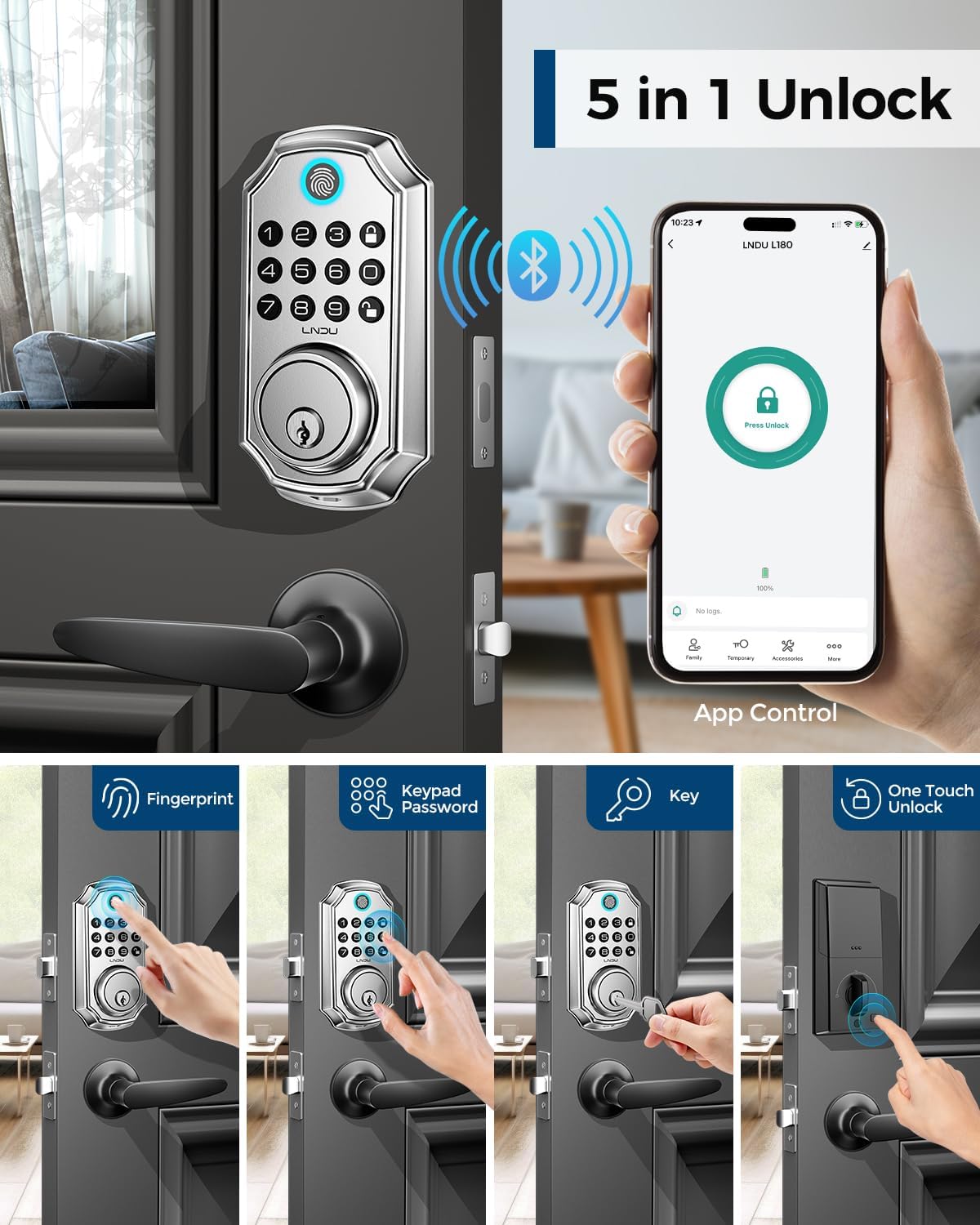 5-in-1 Keyless Entry Door Lock: Front door lock set unlock your front door with bluetooth, fingerprint, passcode, key, or back lock one-touch unlock. Manage access via smartphone app. Advanced fingerprint recognition (up to 50 prints) and digital passcode (stores 50 codes) ensure security and ease of use.