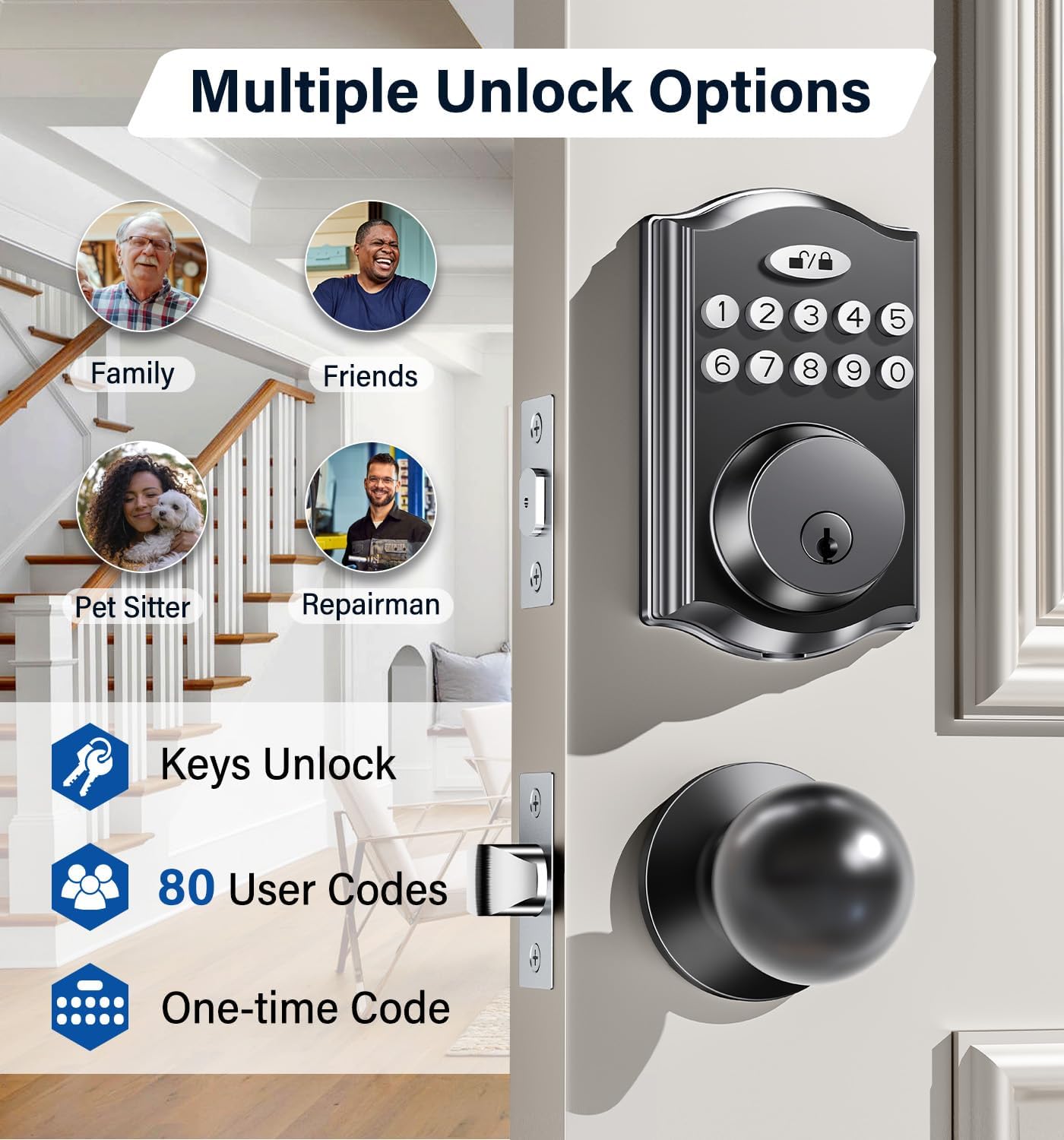 3-in-1 Unlocking Methods: Supports multiple unlocking options, including 80 user passcodes, one-time temporary passwords (automatically disabled after use), and 2 mechanical keys, providing flexible access for family, friends, cleaners, and short-term rental guests.