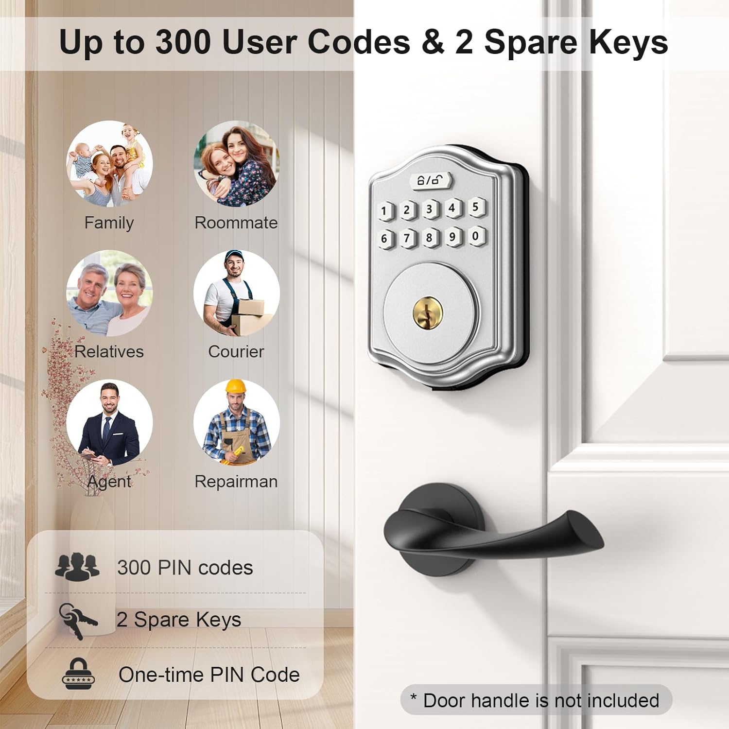 Passcode Entry: This door lock with backlit & highly responsive keypad offers 300 access codes and 2 pcs mechanical keys for use. It makes your life more convenient and secure.