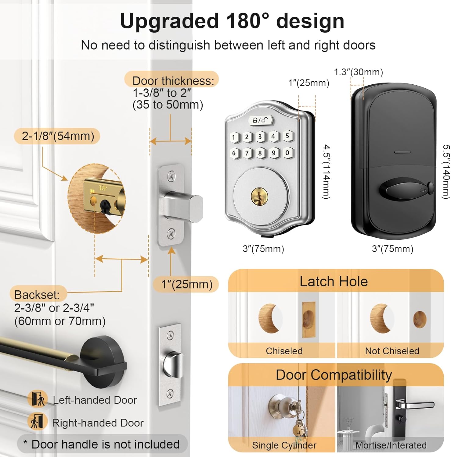 Easy to Install: This upgraded 180° design smart door lock compatible with most standard US left handed and right handed doors, which can be automatically identify left and right doors, no manual settings required. Voice navigation function which supports multiple languages makes your installation and use more convenient and simple.