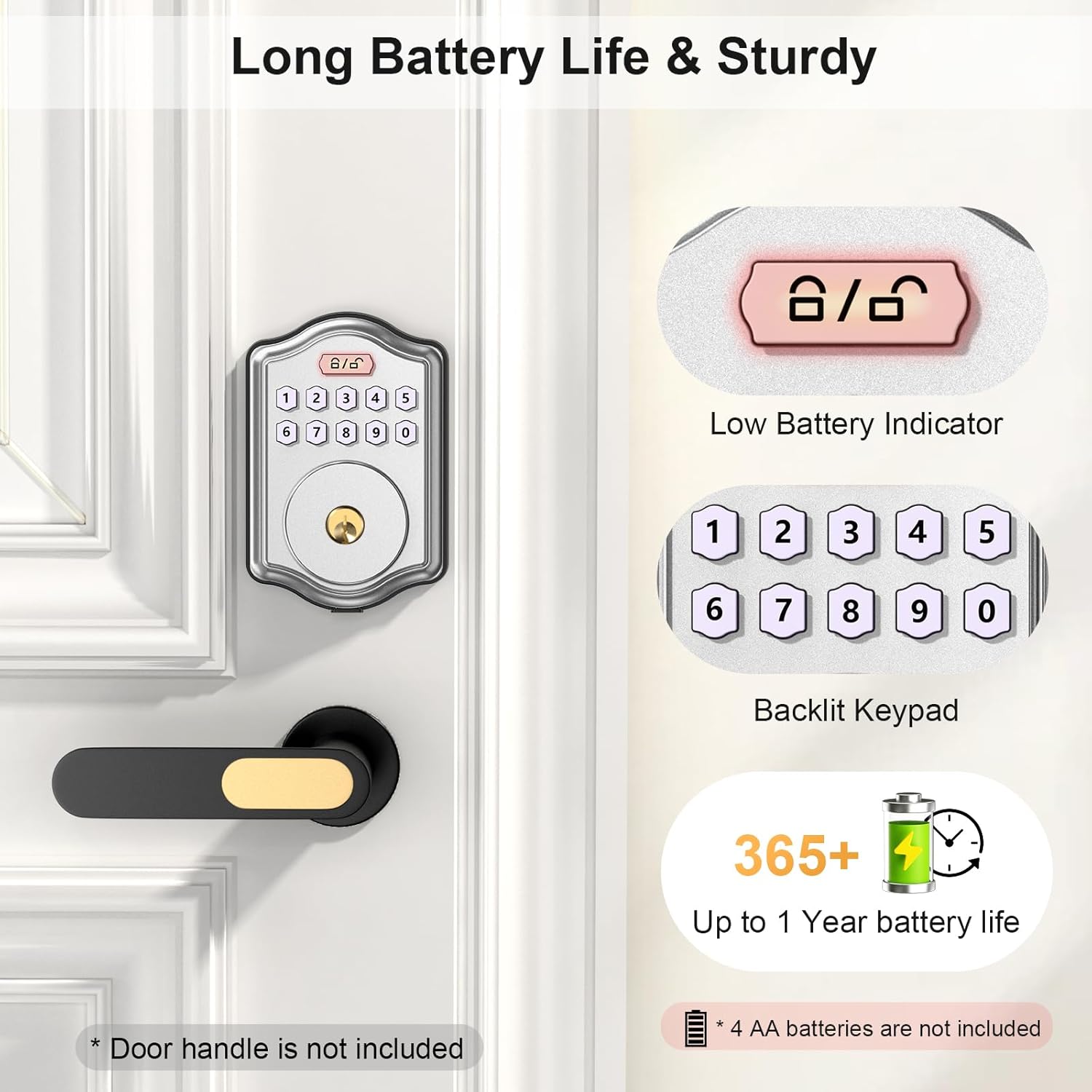 Security and Durability: This electronic door lock is equipped with a low battery alert, privacy mode and other security functions to ensure the safety of your home at all times. Operating temperatures range from -22℉ to 176℉ (-30℃ to 80℃), door lock can be installed indoor or outdoor. IP56 Waterproof. The smart lock powered by 4 AA batteries (Not Included) for more than 1 year.