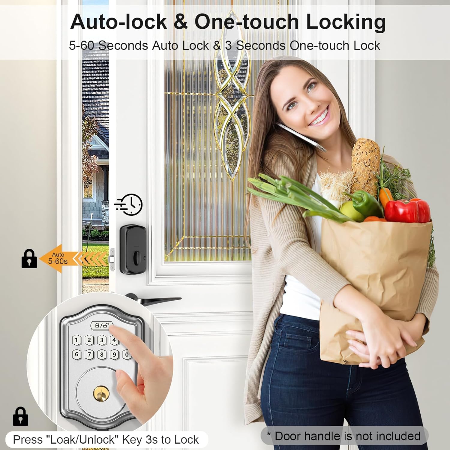 Auto Lock & One-Touch Locking: This keyless entry smart door lock can set to be locked automatically in custom-setting time (5s-60s) after the door closed while you leave home in hurry. and you don’t have to worry about forgetting to lock the deadbolt lock anymore. Or you can press the “lock/unlock” on the panel 3 seconds to lock it immediately.