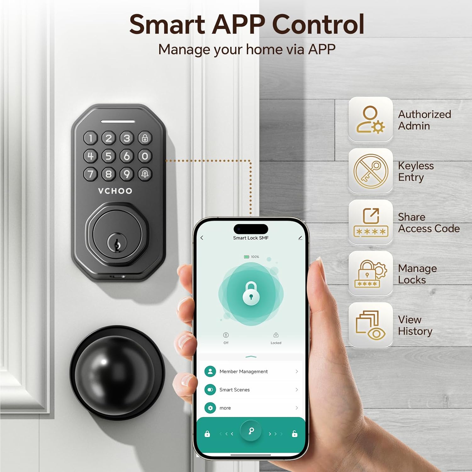 3 in 1 Keyless Entry Door Lock: VCHOO door locks for front door supports multiple ways to unlock: App Control, 100 user codes, one-time code, 2 physics keys. Keypad door lock with handle play an important role in self-housing, hosts, offices, rental property management, hotels.