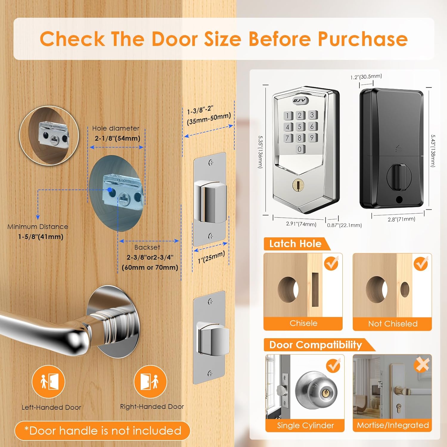 [Easy Installation] This smart door lock can be set up in minutes with just a screwdriver. It suits most standard American doors, whether left or right-opening, with a thickness of 1.38 to 2.17 inches.