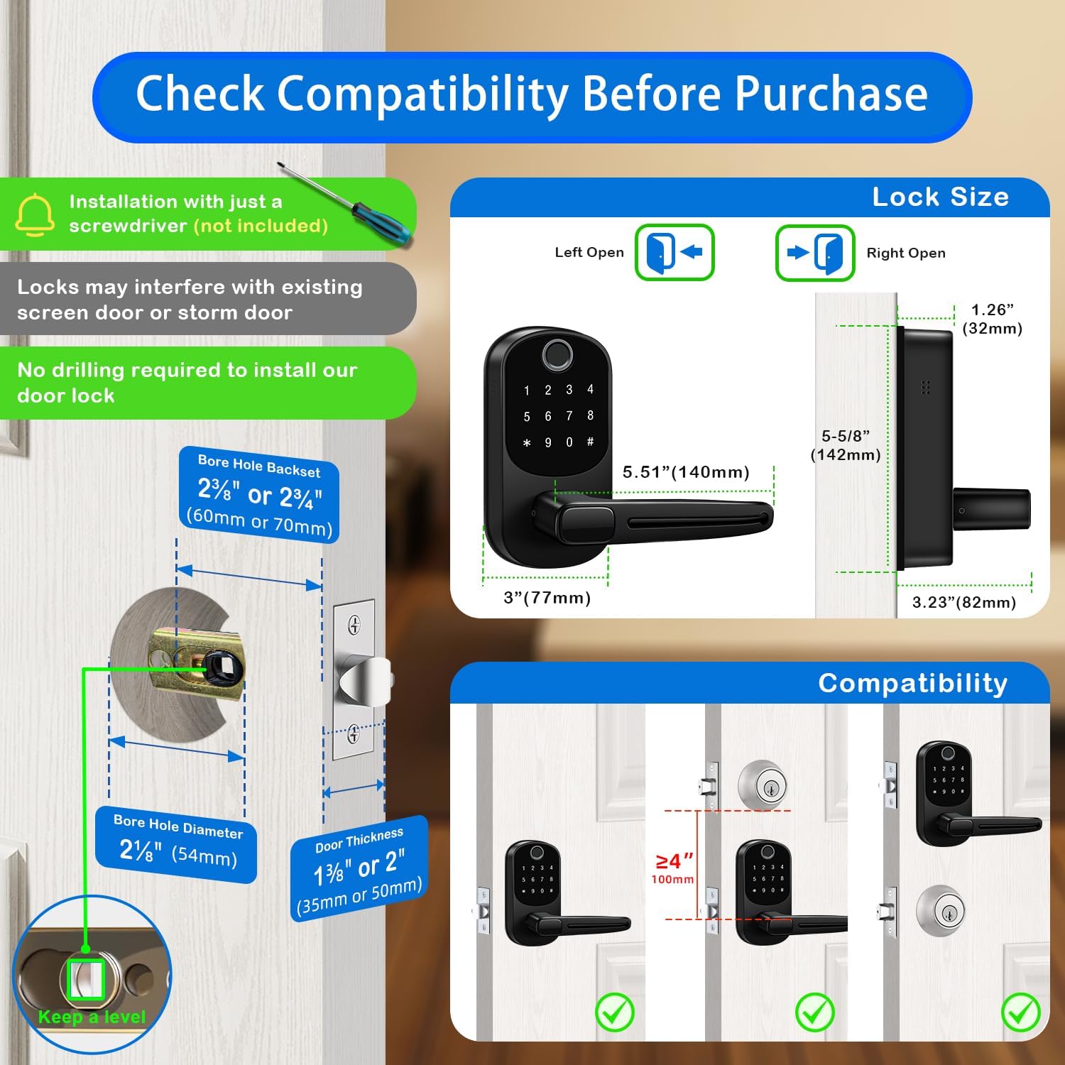 Easy DIY Installation:Easy MSR keypad door lock with handle fits most US standard left and right-handed doors. Install in minutes with just a screwdriver—no wiring or drilling required, you can replace your old smart deadbolt, door handle lock or door knob. fits standard doors with1-3/8 in. to 2-1/8 in.door thickness and 2-3/8 in. or 2-3/4 in. backset. Our door lock with code is only suitable for 2-1/8 in door holes. Perfect for entry door, bedroom door, garage, side, office, or basement doors