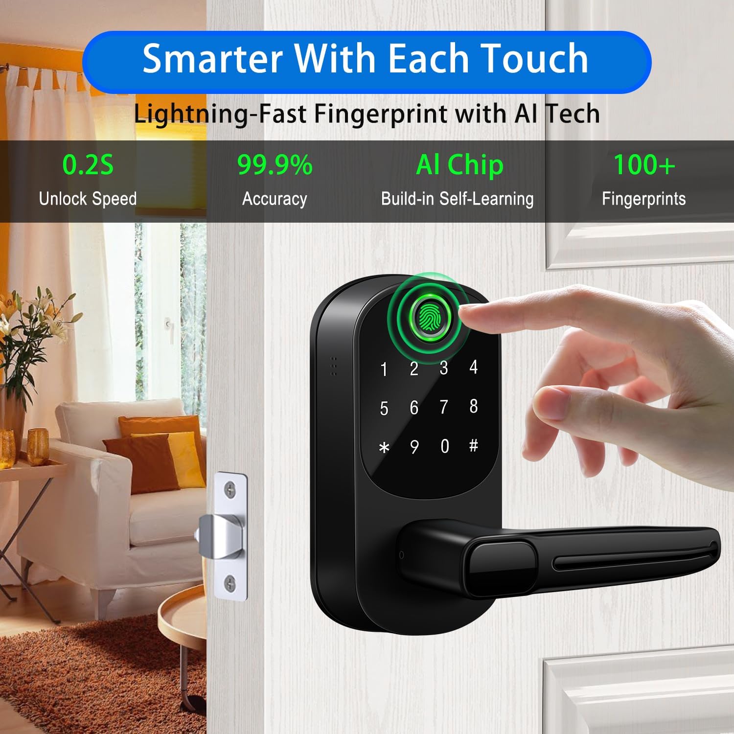 Advanced AI Fingerprint Door Lock:Our fingerprint door knob features cutting-edge AI self-learning biometric technology,becoming more precise with every touch.Unlock your biometric door lock in 1 seconds with 99.9%accuracy.Stores 100+ fingerprints,providing quick and secure access for kids, parents,and friends, ideal for families