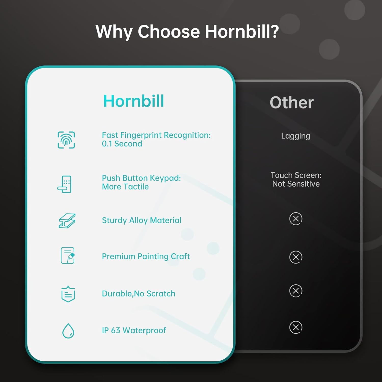 Multi-Function WiFi Lock: Hornbill smart Lock with handle has fingerprint, “Smart Life App”, password, bluetooth, and WiFi unlocking methods to provide you with more choices. It also features auto-lock, anti-theft alert and more. Privacy lock and anti-theft code mode ensure your property safety. Suitable for exterior doors, bedrooms in homes, resorts, Airbnb apartments.