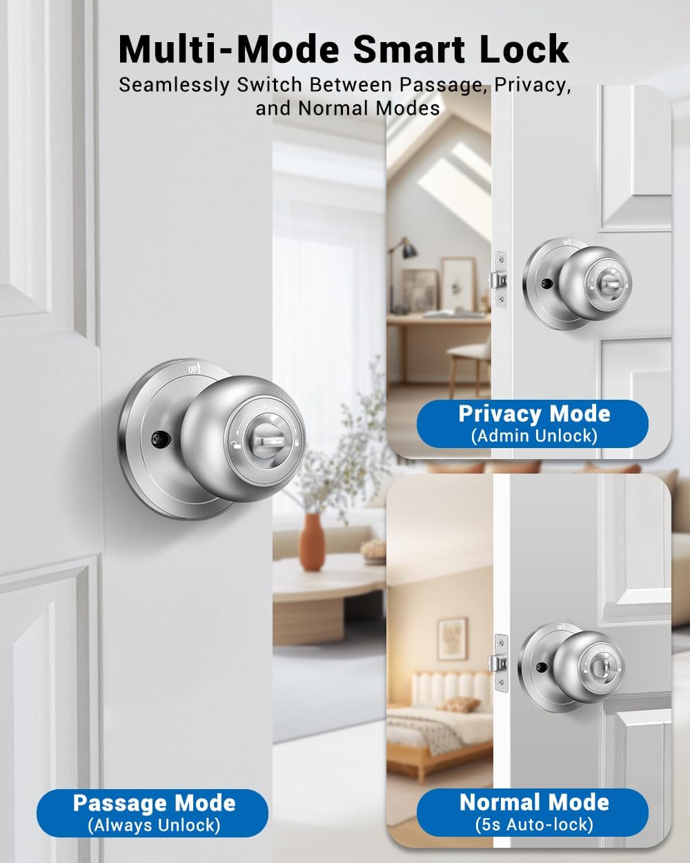 Customizable Access for All Users: Manage access effortlessly with this keypad door lock with handle that supports up to 20 user codes and 3 admin codes. As a bedroom door lock, it ensures easy sharing with family or guests. The backlit keypad allows you to unlock in the dark, while the rechargeable battery ensures uninterrupted functionality. Ideal for rentals, dormitories, or personal spaces, this door knob with lock combines advanced features like passage mode, privacy mode, normal mode and silent mode for ultimate flexibility. For added peace of mind, keep a backup key handy for emergencies.