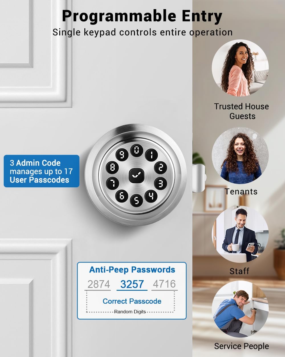 Enhanced Security and Convenience for You: Upgrade your home with a smart door knob that offers unmatched security and convenience. Featuring keyless entry door lock functionality, it supports multiple access modes, including innovative anti-peeping codes and backup keys to keep your entry code private. The door lock is perfect for the front door, bedrooms, and offices, providing peace of mind with 5s auto locking and stable metal construction for added protection. Designed for both style and practicality, this door knob with keypad complements any modern decor.