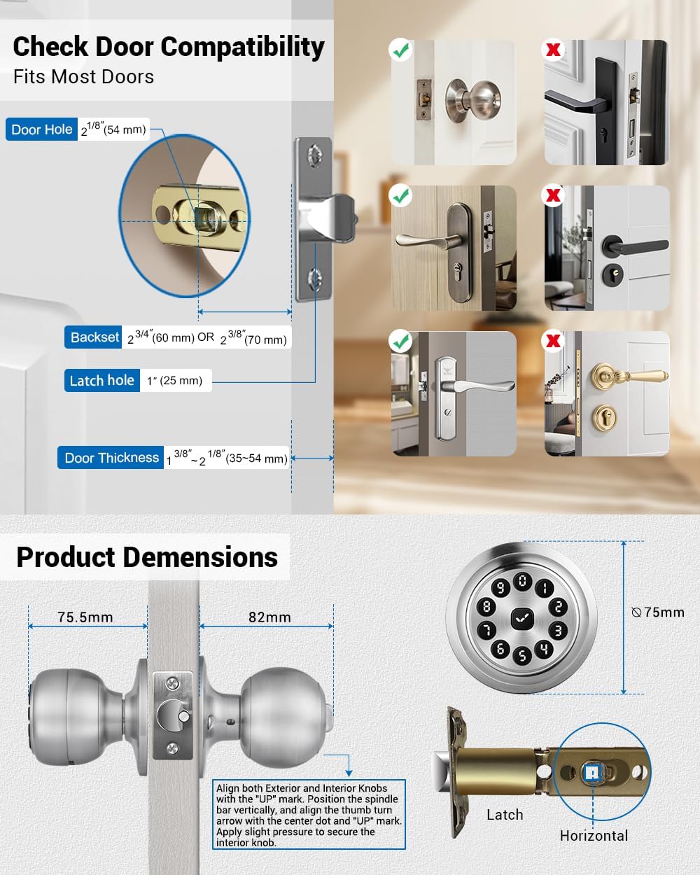 DIY Installation in Minutes: Simplify your life with a bedroom door knob with lock that’s easy to install. With adjustable latch compatibility (1-3/8″ to 2-1/8″ door thickness), this electronic door lock fits most US doors. Set it up with just a screwdriver and enjoy an instant upgrade. Before installation, simply charge the bedroom door knobs with lock using the Type-C cable for 3 hours. When installing the interior knob, align both Exterior and Interior Knobs with the “UP” mark. Position the spindle bar vertically, and align the thumb turn arrow with the center dot and “UP” mark. Apply slight pressure to secure the interior knob.