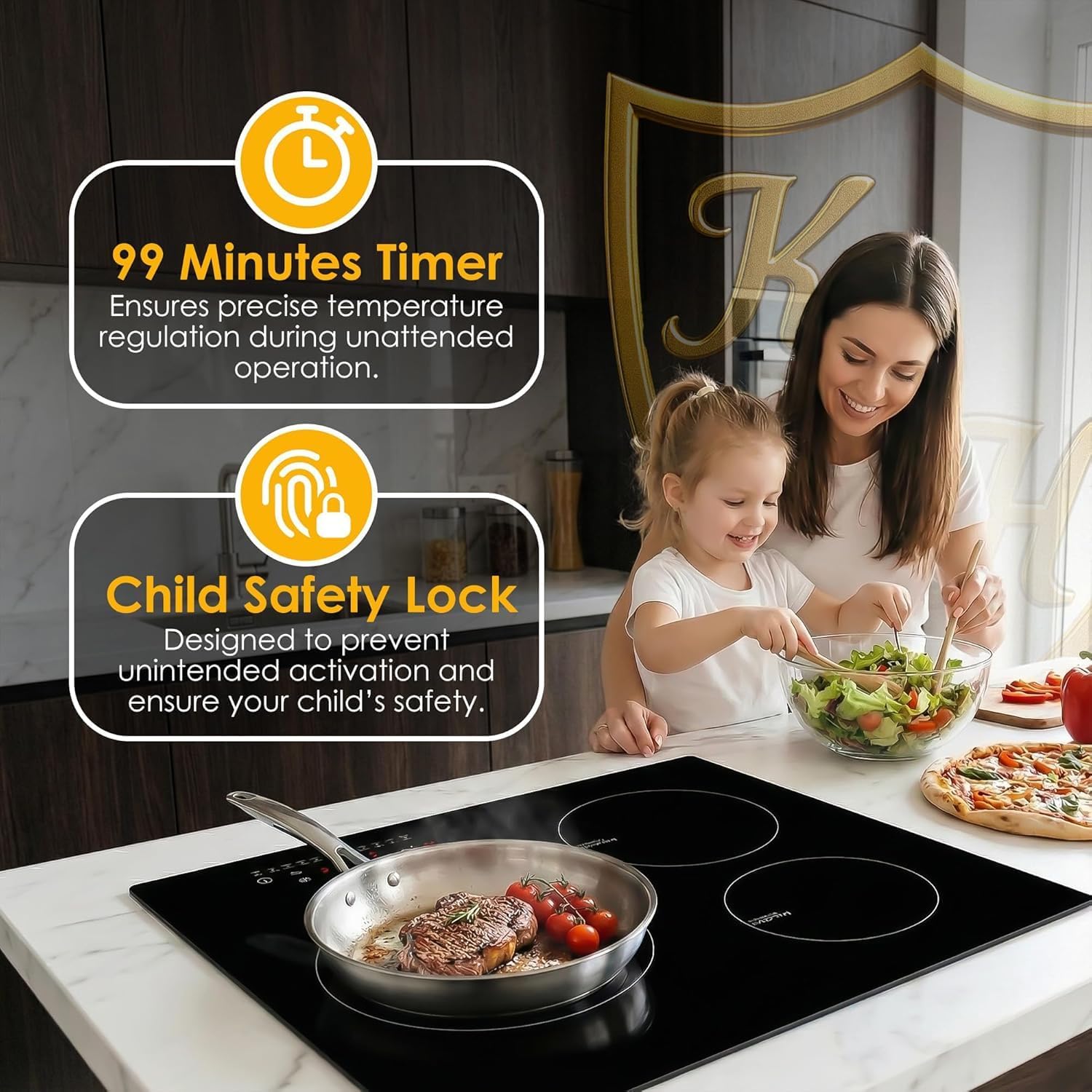 This induction cooktop features a child safety lock to ensure safe cooking with little ones around. Perfect as an induction hot plate at home and as a built-in stove that offers versatility and safety. It’s great for use with any induction cookware for everyday cooking.