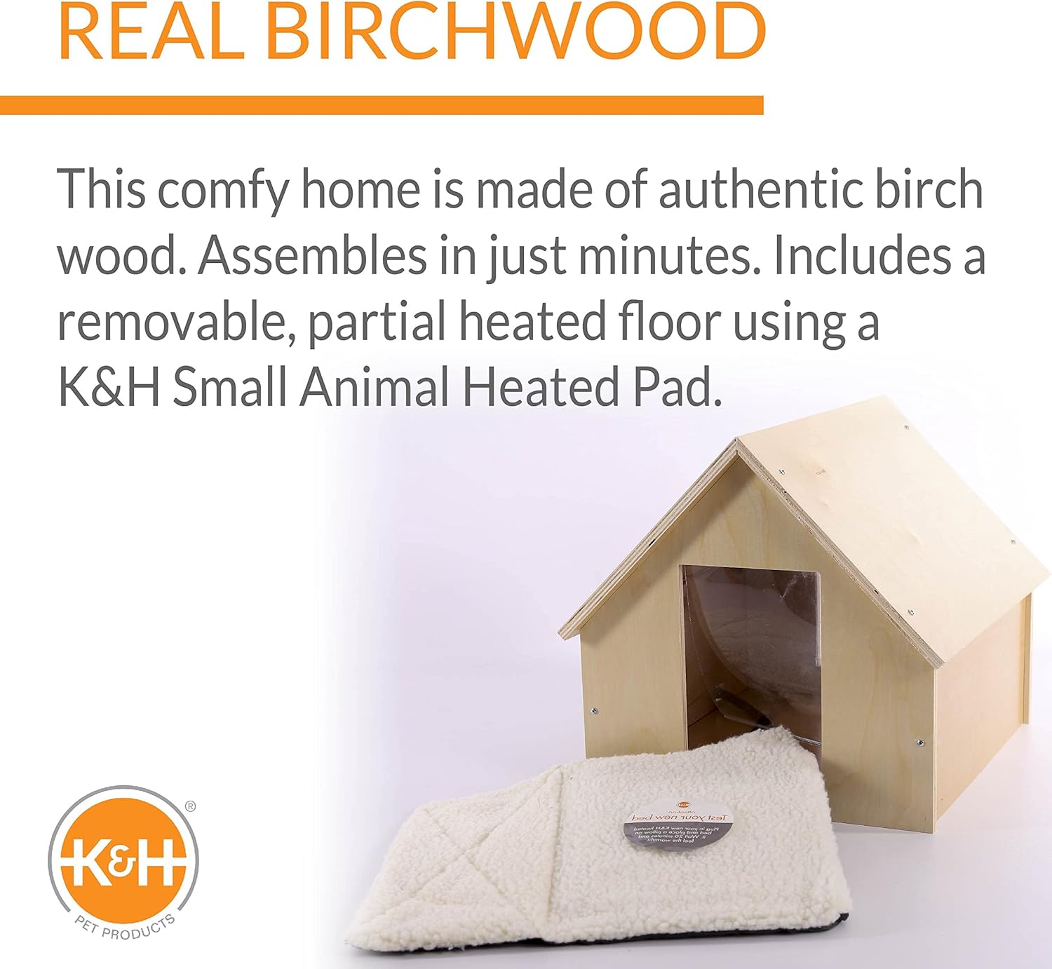 Using real birch, the Birchwood Manor Thermo-Kitty Home incorporates true genius into the sturdy construction of this outdoor/indoor home. It assembles in just minutes and includes two doors (emergency exits) and two door flaps. The heated version comes with a removable, partial heated floor using a K&H Small Animal Heated Pad so the cat can choose to be on or off the warmth. Provides ultimate cool weather comfort. The UV resistant coating will keep this house looking beautiful even in harsh weather conditions. Perfect for every cat, outdoor or indoor. Paintable, customizable, affordable and fun to decorate! Also available in unheated. Two year limited warranty.