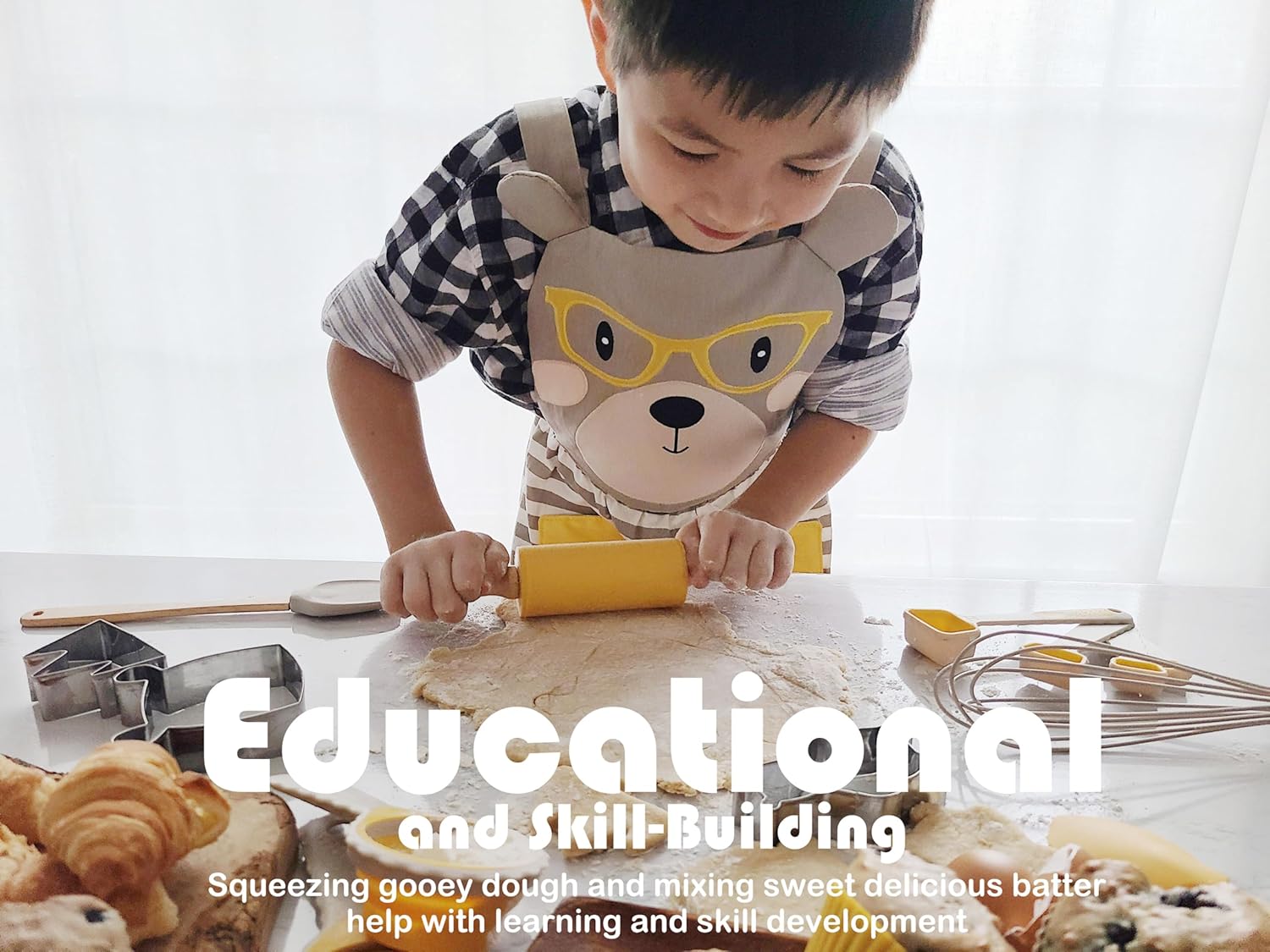 🎂 Lovingly Crafted with Quality and Care: Our silicone baking set was made with years of quality baking time in mind. Featuring food-grade silicone, real wooden accessory handles, stainless steel and high-quality cotton canvas, our kitchen set for kids is built to last. Of course, everything is BPA-free and non-toxic too!