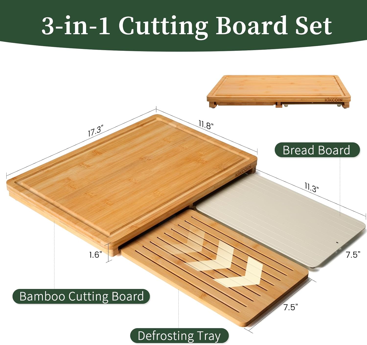 ALL-IN-ONE MEAL PREP KIT – You will receive a 100% bamboo cutting board for everyday chopping, an aluminum defrosting tray for frozen meat, and a bread cutting board for slicing bread. One Cutting Board set for all your meal prep needs