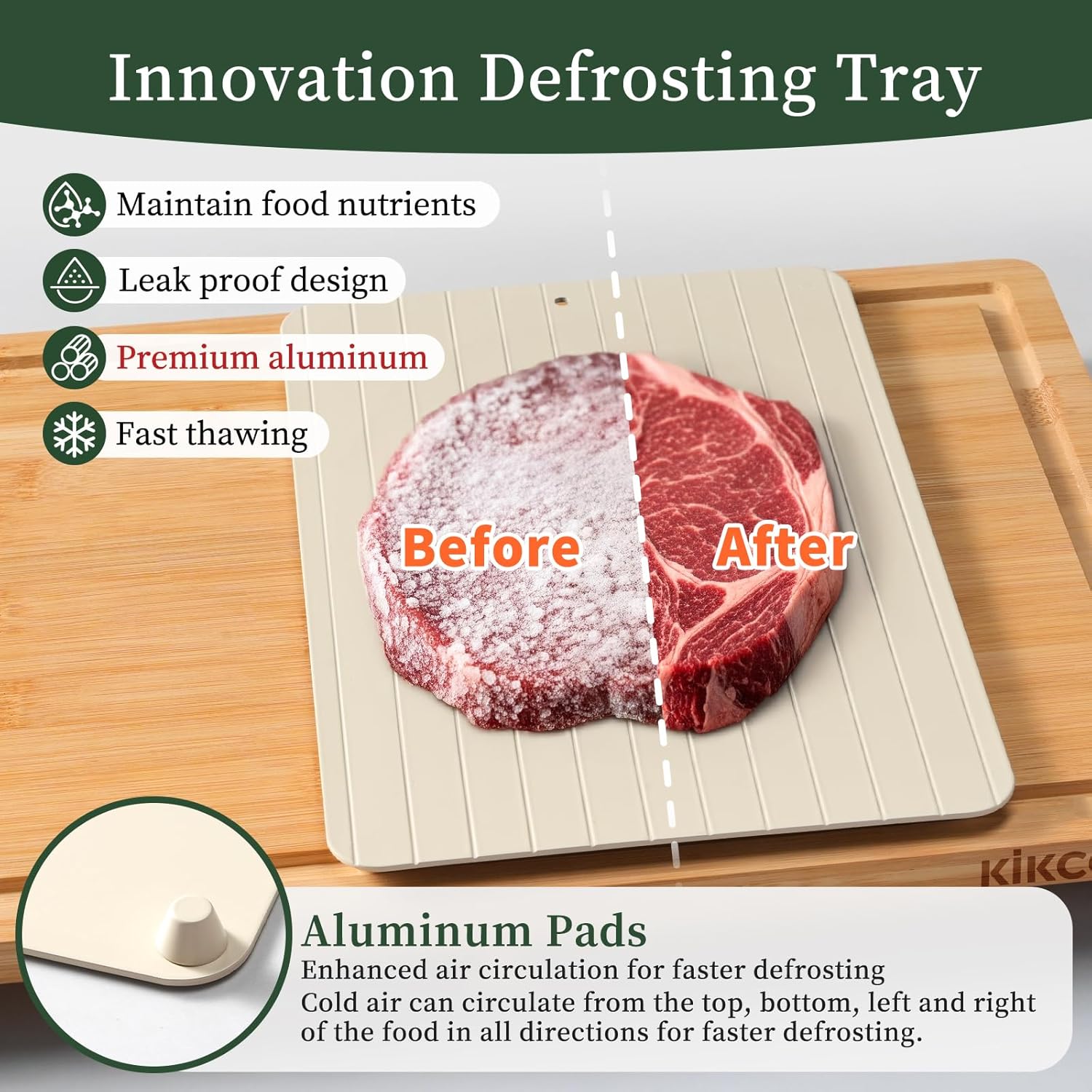 NATURAL DEFROSTING – No electricity or microwave oven required, say goodbye to traditional hot water immersion and shorten defrosting time from hours to minutes! Our defrosting trays are made of highly thermally conductive aluminum, which is a healthy way of defrosting ingredients by defrosting meat evenly and quickly, retaining maximum nutrients and texture. Great for foods such as chicken, fish, steaks and meat. It is an essential tool for our kitchen!