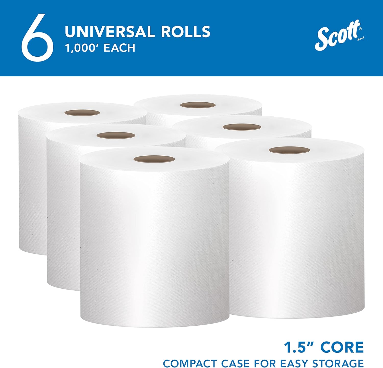 1,000’/Roll, 6 Scott Essential Universal High-Capacity Hard Roll Towel Rolls/Case; 6,000’/Case; with Absorbency Pockets; 1.5″ Core; White